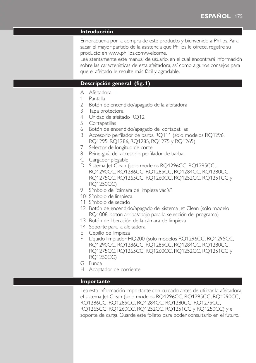 Afeitadora Pantalla Botón de encendido/apagado de la afeitadora Tapa protectora Unidad de afeitado RQ12 Cortapatillas Botón de encendido/apagado del cortapatillas Accesorio perfilador de barba RQ111 (solo modelos RQ1296, RQ1295, RQ1286, RQ1285, RQ1275 y RQ1265) Selector de longitud de corte Peine-guía del accesorio perfilador de barba Cargador plegable Sistema Jet Clean (solo modelos RQ1296CC, RQ1295CC, RQ1290CC, RQ1286CC, RQ1285CC, RQ1284CC, RQ1280CC, RQ1275CC, RQ1265CC, RQ1260CC, RQ1252CC, RQ1251CC y RQ1250CC) Símbolo de “cámara de limpieza vacía” Símbolo de limpieza Símbolo de secado Botón de encendido/apagado del sistema Jet Clean (sólo modelo RQ1008: botón arriba/abajo para la selección del programa) Botón de liberación de la cámara de limpieza Soporte para la afeitadora Cepillo de limpieza Líquido limpiador HQ200 (solo modelos RQ1296CC, RQ1295CC, RQ1290CC, RQ1286CC, RQ1285CC, RQ1284CC, RQ1280CC, RQ1275CC, RQ1265CC, RQ1260CC, RQ1252CC, RQ1251CC y RQ1250CC) Funda Adaptador de corriente Importante Lea esta información importante con cuidado antes de utilizar la afeitadora, el sistema Jet Clean (solo modelos RQ1296CC, RQ1295CC, RQ1290CC, RQ1286CC, RQ1285CC, RQ1284CC, RQ1280CC, RQ1275CC, RQ1265CC, RQ1260CC, RQ1252CC, RQ1251CC y RQ1250CC) y el soporte de carga. Guarde este folleto para poder consultarlo en el futuro. 176 ESPAÑOL Peligro -- Mantenga el adaptador seco. Advertencia -- El adaptador incorpora un transformador. No corte el adaptador para sustituirlo por otra clavija, ya que podría provocar situaciones de peligro. -- La afeitadora, el sistema Jet Clean y el soporte de carga no deben ser usados por personas (adultos o niños) con su capacidad física, psíquica o sensorial reducida, ni por quienes no tengan los conocimientos y la experiencia necesarios, a menos que sean supervisados o instruidos acerca del uso de estos aparatos por una persona responsable de su seguridad. -- Asegúrese de que los niños no jueguen con la afeitadora, el sistema Jet Clean ni el soporte de carga. -- Desenchufe siempre la afeitadora antes de limpiarla bajo el grifo. Precaución -- No sumerja nunca el sistema Jet Clean ni el soporte de carga en agua ni los enjuague bajo el grifo. -- No utilice nunca agua a una temperatura superior a 80 °C para enjuagar la afeitadora. -- No utilice la afeitadora, el sistema Jet Clean, el adaptador, el soporte de carga ni ninguna otra pieza si están dañados, ya que podría ocasionar lesiones. Sustituya siempre un adaptador, un soporte de carga o una pieza dañados con uno del modelo original. -- Utilice solo el sistema Jet Clean con la solución Jet Clean HQ200 original. -- Coloque siempre el sistema Jet Clean sobre una superficie horizontal, plana y estable para evitar que el líquido se derrame. -- Cuando el sistema Jet Clean esté listo parar usar, no lo mueva para evitar que el líquido limpiador se derrame. -- El sistema Jet Clean limpia a fondo pero no desinfecta la afeitadora, por lo que no debe compartirla con otras personas. -- No utilice nunca aire comprimido, estropajos, agentes abrasivos ni líquidos agresivos, como gasolina o acetona, para limpiar el aparato. -- Cuando enjuague la afeitadora es posible que salga agua por el orificio de su parte inferior. Esto es normal y no es peligroso, ya que todos los sistemas electrónicos están dentro de una unidad motora hermética en el interior de la afeitadora. Cumplimiento de normas -- Esta afeitadora es resistente al agua y cumple las normas de seguridad aprobadas internacionalmente. Se puede utilizar en la bañera o la ducha y se puede limpiar bajo el grifo. Por lo tanto, por motivos de seguridad, la afeitadora solo funciona sin cable. -- La afeitadora y el sistema Jet Clean cumplen los estándares y las normativas aplicables sobre exposición a campos electromagnéticos. General -- El adaptador está equipado con un selector automático de voltaje y es apto para voltajes de red entre 100 y 240 voltios. -- El adaptador transforma la corriente de 100 - 240 voltios en un bajo voltaje de seguridad inferior a 24 voltios. -- Nivel de ruido máximo: Lc = 69 dB(A) ESPAÑOL 177 La pantalla Nota: Antes de utilizar la afeitadora por primera vez, quite la lámina protectora de la pantalla. Los modelos de afeitadora tienen pantallas diferentes, tal y como se muestra en las imágenes siguientes. -- RQ1296, RQ1295, RQ1290, RQ1286, RQ1285, RQ1280 Carga -- La afeitadora tarda aproximadamente 1 hora en cargarse. RQ129x, RQ128x -- Mientras la afeitadora se está cargando, la indicación de minutos parpadea. -- Los minutos de afeitado aumentan hasta que la afeitadora está completamente cargada. -- Carga rápida: cuando la afeitadora tiene suficiente energía para un afeitado, la pantalla muestra 5 minutos en rojo. RQ127x, RQ126x, RQ125x Nota: La pantalla de los distintos modelos son diferentes, pero los pilotos de carga funcionan del mismo modo. ESPAÑOL -- Cuando la afeitadora se está cargando, primero parpadea el piloto de carga inferior, luego el segundo piloto de carga, y así sucesivamente hasta que la afeitadora se carga por completo. -- Carga rápida: cuando la afeitadora tiene suficiente energía para un afeitado, el piloto de carga inferior parpadea alternativamente de color naranja y blanco. Batería completamente cargada RQ129x, RQ128x -- Cuando la batería está completamente cargada, la indicación de minutos se ilumina de forma continua. Después de unos 30 minutos, la pantalla se vuelve a apagar automáticamente. Nota: La afeitadora dispone de un sistema inteligente de autoaprendizaje que vigila el consumo de energía de la afeitadora y convierte la capacidad de la batería restante en minutos de afeitado. El consumo de energía y, por tanto, el número restante de minutos de afeitado dependen de la piel, del tipo de barba y de su forma de afeitarse (por ejemplo, el uso de gel para el afeitado). Es completamente normal que el número de minutos de afeitado sea inferior a 60 cuando la af