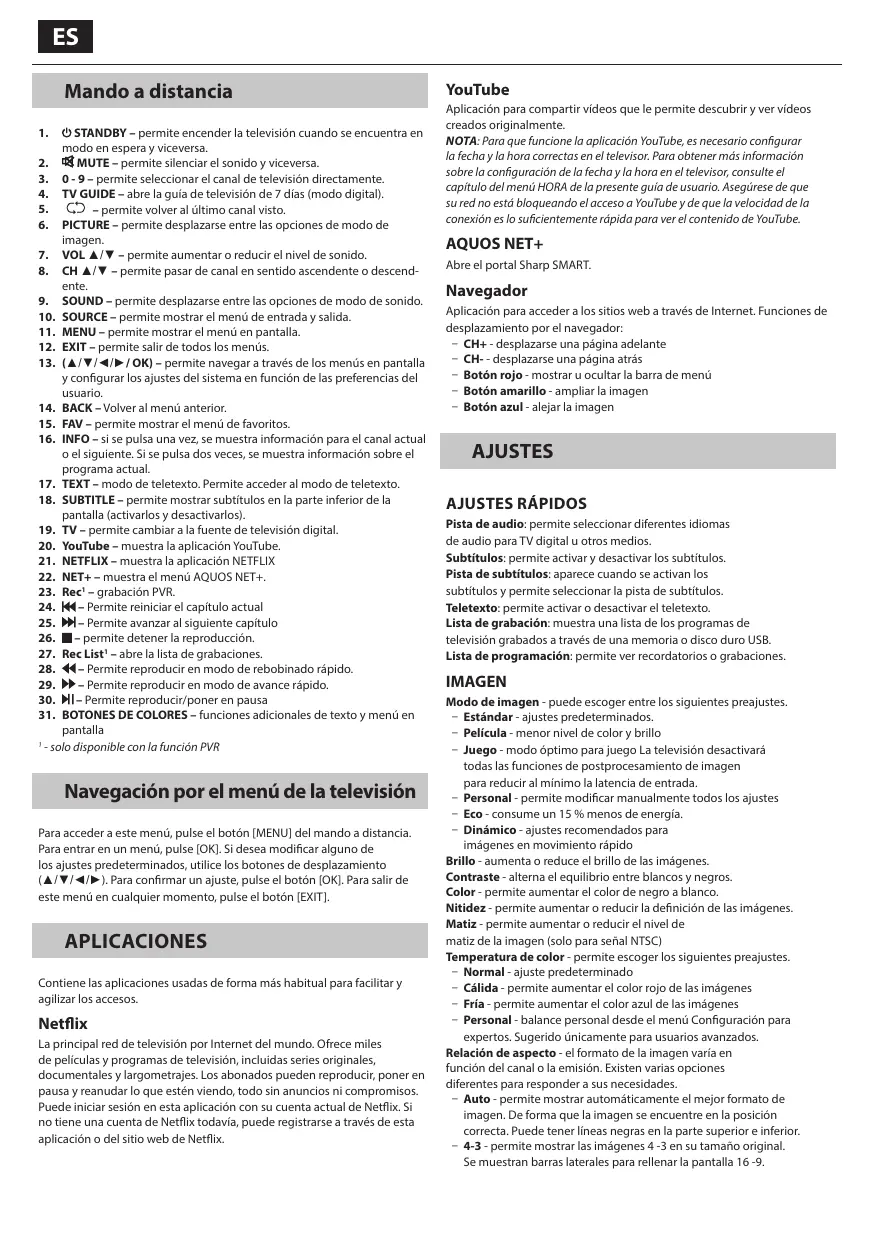 2. MUTE – permite silenciar el sonido y viceversa. 3. 0 - 9 – permite seleccionar el canal de televisión directamente. 4. TV GUIDE – abre la guía de televisión de 7 días (modo digital). 5. – permite volver al último canal visto. 6. PICTURE – permite desplazarse entre las opciones de modo de imagen. 7. VOL ▲/▼ – permite aumentar o reducir el nivel de sonido. 8. CH ▲/▼ – permite pasar de canal en sentido ascendente o descendente. 9. SOUND – permite desplazarse entre las opciones de modo de sonido. 10. SOURCE – permite mostrar el menú de entrada y salida. 11. MENU – permite mostrar el menú en pantalla. 12. EXIT – permite salir de todos los menús. 13. (▲/▼/◄/►/ OK) – permite navegar a través de los menús en pantalla y configurar los ajustes del sistema en función de las preferencias del usuario. 14. BACK – Volver al menú anterior. 15. FAV – permite mostrar el menú de favoritos. 16. INFO – si se pulsa una vez, se muestra información para el canal actual o el siguiente. Si se pulsa dos veces, se muestra información sobre el programa actual. 17. TEXT – modo de teletexto. Permite acceder al modo de teletexto. 18. SUBTITLE – permite mostrar subtítulos en la parte inferior de la pantalla (activarlos y desactivarlos). 19. TV – permite cambiar a la fuente de televisión digital. 20. YouTube – muestra la aplicación YouTube. 21. NETFLIX – muestra la aplicación NETFLIX 22. NET+ – muestra el menú AQUOS NET+. 23. Rec1 – grabación PVR. 24. – Permite reiniciar el capítulo actual 25. – Permite avanzar al siguiente capítulo 26. – permite detener la reproducción. 27. Rec List1 – abre la lista de grabaciones. 28. – Permite reproducir en modo de rebobinado rápido. 29. – Permite reproducir en modo de avance rápido. 30. – Permite reproducir/poner en pausa 31. BOTONES DE COLORES – funciones adicionales de texto y menú en pantalla 1