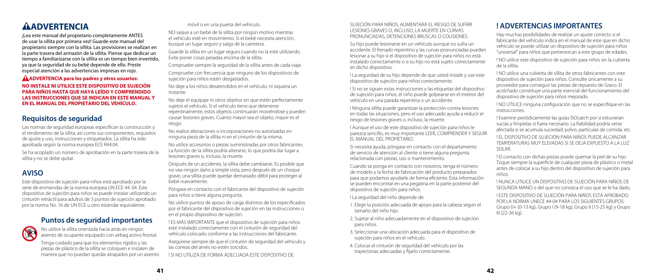 Compruebe siempre la seguridad de la sillita antes de cada viaje. Compruebe con frecuencia que ninguno de los dispositivos de sujeción para niños estén desgastados. No deje a los niños desatendidos en el vehículo, ni siquiera un instante. No deje el equipaje ni otros objetos sin que estén perfectamente sujetos el vehículo. Si el vehículo tiene que detenerse repentinamente, estos objetos continuarán moviéndose y pueden causar lesiones graves. Cuanto mayor sea el objeto, mayor es el riesgo. No realice alteraciones o incorporaciones no autorizadas en ninguna pieza de la sillita ni en el cinturón de la misma. No utilice accesorios o piezas suministradas por otros fabricantes. La función de la sillita podría alterarse, lo que podría dar lugar a lesiones graves o, incluso, la muerte. Después de un accidente, la sillita debe cambiarse. Es posible que no vea ningún daño a simple vista, pero después de un choque grave, una sillita puede quedar demasiado débil para proteger al bebé nuevamente. Póngase en contacto con el fabricante del dispositivo de sujeción para niños si tiene alguna pregunta. No utilice puntos de apoyo de carga distintos de los especificados por el fabricante del dispositivo de sujeción en las instrucciones o en el propio dispositivo de sujeción. ! ES MÁS IMPORTANTE que el dispositivo de sujeción para niños esté instalado correctamente con el cinturón de seguridad del vehículo colocado conforme a las instrucciones del fabricante. Asegúrese siempre de que el cinturón de seguridad del vehículo y las correas del arnés no estén torcidos.