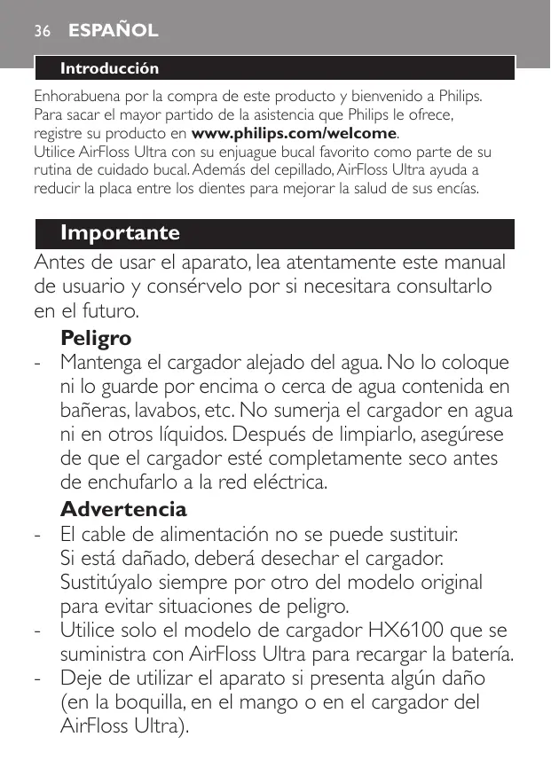 Importante Antes de usar el aparato, lea atentamente este manual de usuario y consérvelo por si necesitara consultarlo en el futuro. Peligro -- Mantenga el cargador alejado del agua. No lo coloque ni lo guarde por encima o cerca de agua contenida en bañeras, lavabos, etc. No sumerja el cargador en agua ni en otros líquidos. Después de limpiarlo, asegúrese de que el cargador esté completamente seco antes de enchufarlo a la red eléctrica. Advertencia -- El cable de alimentación no se puede sustituir. Si está dañado, deberá desechar el cargador. Sustitúyalo siempre por otro del modelo original para evitar situaciones de peligro. -- Utilice solo el modelo de cargador HX6100 que se suministra con AirFloss Ultra para recargar la batería. -- Deje de utilizar el aparato si presenta algún daño (en la boquilla, en el mango o en el cargador del AirFloss Ultra).