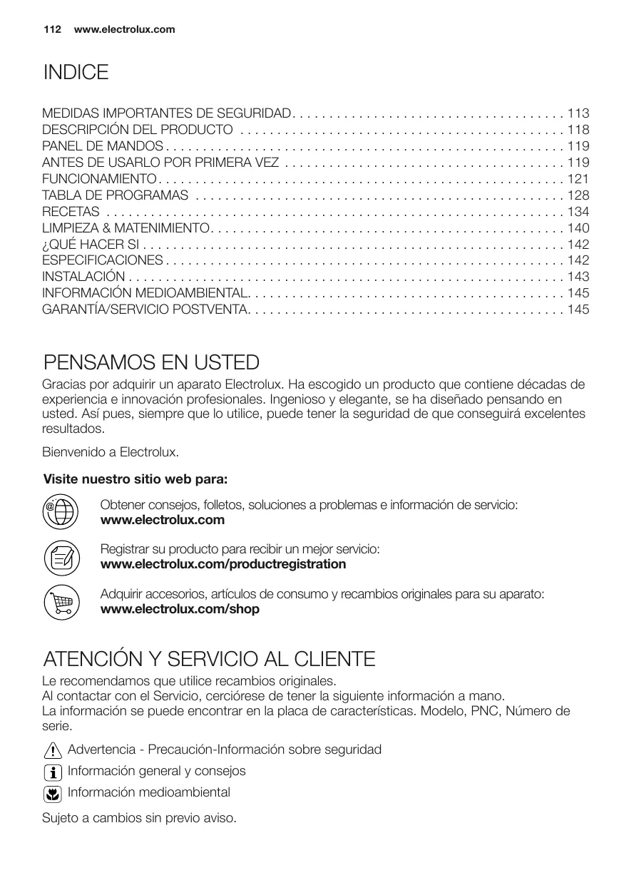 PENSAMOS EN USTED Gracias por adquirir un aparato Electrolux. Ha escogido un producto que contiene décadas de experiencia e innovación profesionales. Ingenioso y elegante, se ha diseñado pensando en usted. Así pues, siempre que lo utilice, puede tener la seguridad de que conseguirá excelentes resultados.