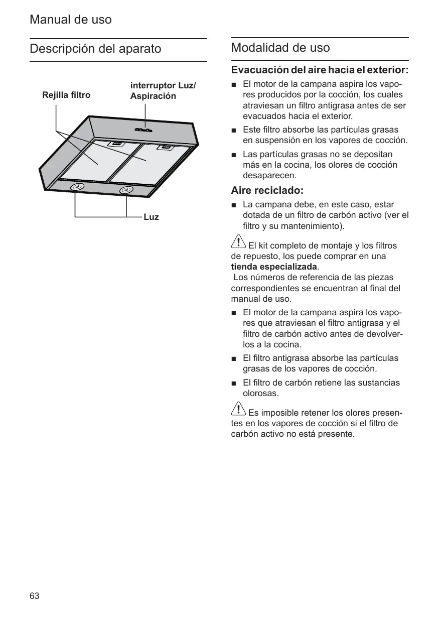 La campana debe, en este caso, estardotada de un filtro de carbón activo (ver elfiltr y su mantenimiento).