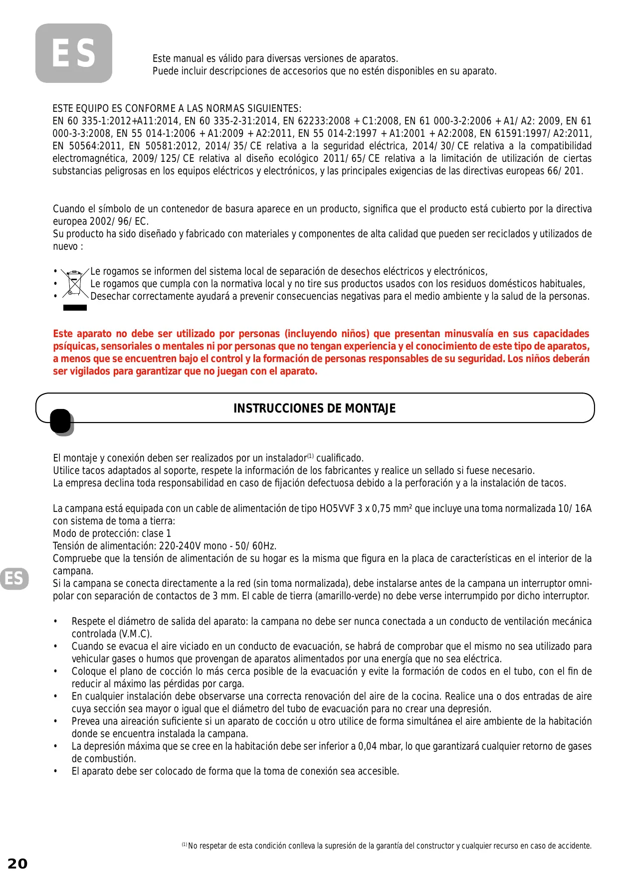 EN 60 335-1:2012+A11:2014, EN 60 335-2-31:2014, EN 62233:2008 + C1:2008, EN 61 000-3-2:2006 + A1/A2: 2009, EN 61 000-3-3:2008, EN 55 014-1:2006 + A1:2009 + A2:2011, EN 55 014-2:1997 + A1:2001 + A2:2008, EN 61591:1997/A2:2011, EN 50564:2011, EN 50581:2012, 2014/35/CE relativa a la seguridad eléctrica, 2014/30/CE relativa a la compatibilidad electromagnética, 2009/125/CE relativa al diseño ecológico 2011/65/CE relativa a la limitación de utilización de ciertas substancias peligrosas en los equipos eléctricos y electrónicos, y las principales exigencias de las directivas europeas 66/201. Cuando el símbolo de un contenedor de basura aparece en un producto, significa que el producto está cubierto por la directiva europea 2002/96/EC. Su producto ha sido diseñado y fabricado con materiales y componentes de alta calidad que pueden ser reciclados y utilizados de nuevo : • • •