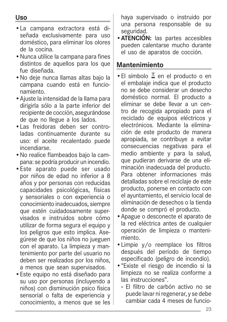 •La campana extractora está diseguridad. señada exclusivamente para uso •ATENCIÓN: las partes accesibles doméstico, para eliminar los olores pueden calentarse mucho durante de la cocina. el uso de aparatos de cocción. •Nunca utilice la campana para fines distintos de aquellos para los que Mantenimiento fue diseñada. •No deje nunca llamas altas bajo la •El símbolo en el producto o en el embalaje indica que el producto campana cuando está en funciono se debe considerar un desecho namiento. doméstico normal. El producto a •Ajuste la intensidad de la llama para eliminar se debe llevar a un cendirigirla sólo a la parte inferior del tro de recogida apropiado para el recipiente de cocción, asegurándose reciclado de equipos eléctricos y de que no llegue a los lados. electrónicos. Mediante la elimina•Las freidoras deben ser controción de este producto de manera ladas continuamente durante su apropiada, se contribuye a evitar uso: el aceite recalentado puede consecuencias negativas para el incendiarse. medio ambiente y para la salud, •No realice flambeados bajo la camque pudieran derivarse de una elipana: se podría producir un incendio. minación inadecuada del producto. •Este aparato puede ser usado Para obtener informaciones más por niños de edad no inferior a 8 detalladas sobre el reciclaje de este años y por personas con reducidas producto, ponerse en contacto con capacidades psicológicas, físicas el ayuntamiento, el servicio local de y sensoriales o con experiencia o eliminación de desechos o la tienda conocimiento inadecuados, siempre donde se compró el producto. que estén cuidadosamente supervisados e instruidos sobre cómo •Apague o desconecte el aparato de la red eléctrica antes de cualquier utilizar de forma segura el equipo y operación de limpieza o mantenilos peligros que esto implica. Asemiento. gúrese de que los niños no jueguen con el aparato. La limpieza y man- •Limpie y/o reemplace los filtros después del período de tiempo tenimiento por parte del usuario no especificado (peligro de incendio). deben ser realizados por los niños, • “Existe el riesgo de incendio si la a menos que sean supervisados. limpieza no se realiza conforme a •Este equipo no está diseñado para las instrucciones”. su uso por personas (incluyendo a -- El filtro de carbón activo no se niños) con disminución psico física puede lavar ni regenerar, y se debe sensorial o falta de experiencia y cambiar cada 4 meses de funcioconocimiento, a menos que se les 23