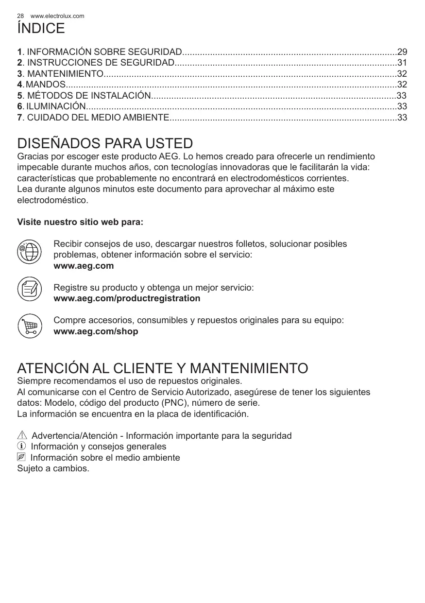 Gracias por escoger este producto AEG. Lo hemos creado para ofrecerle un rendimiento impecable durante muchos años, con tecnologías innovadoras que le facilitarán la vida: características que probablemente no encontrará en electrodomésticos corrientes. Lea durante algunos minutos este documento para aprovechar al máximo este electrodoméstico. Visite nuestro sitio web para: Recibir consejos de uso, descargar nuestros folletos, solucionar posibles problemas, obtener información sobre el servicio: www.aeg.com Registre su producto y obtenga un mejor servicio: www.aeg.com/productregistration Compre accesorios, consumibles y repuestos originales para su equipo: www.aeg.com/shop