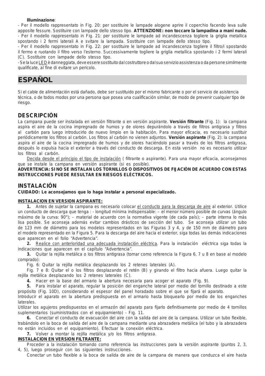 INSTALACION EN VERSION ASPIRANTE: 1. Antes de sujetar la campana es necesario colocar el conducto para la descarga de aire al exterior. Utilice un conducto de descarga que tenga : - longitud mínima indispensable: – el menor número posible de curvas (ángulo máximo de la curva: 90°); – material de acuerdo con la normativa vigente (de cada país); – parte interna lo más lisa posible. Se aconseja además evitar cambios drásticos de sección del tubo. Se aconseja utilizar un tubo de 123 mm de diámetro para los modelos representados en las Figuras 3 y 4, y de 150 mm de diámetro para el modelo representado en la Figura 5. Para la descarga del aire hacia el exterior, siga todas las demás indicaciones que aparecen en el folio “Advertencia”. 2. Realice con anterioridad una adecuada instalación eléctrica. Para la instalación eléctrica siga todas la indicaciones que aparecen en el capítulo “Advertencia”. 3. Quitar la rejilla metálica o los filtros antigrasa (tomar como referencia la Figura 6, 7 u 8 en base al modelo comprado): Fig. 6: Quitar la rejilla metálica desplazando los 2 retenes laterales (A). Fig. 7 e 8: Quitar el o los filtros desplazando el retén (B) y girando el filtro hacia afuera. Luego quitar la rejilla metálica desplazando los 2 retenes laterales (C). 4. Hacer en la base del armario la abertura necesaria para acoger el aparato (Fig. 9). 5. Para instalar el aparato, regular la posición del enganche lateral por medio del tornillo destinado a este propósito (Fig. 10D), considerando el espesor del panel horadado sobre el que se fijará el aparato. Introducir el aparato en la abertura predispuesta en el armario hasta bloquearlo por medio de los enganches laterales. Utilizar los agujeros predispuestos en el armazón del aparato para fijarlo definitivamente por medio de 4 tornillos suplementarios (suministrados con el equipamiento) - Fig. 11. 6. Conectar el conducto de evacuación del aire con la salida del aire de la campana. Utilizar un tubo flexible, trabándolo en la boca de salida del aire de la campana mediante una abrazadera metálica (el tubo y la abrazadera no están incluidos en el equipamiento). Efectuar la conexión eléctrica. 7. Volver a montar la rejilla metálica y/o los filtros antigrasa. INSTALACION EN VERSION FILTRANTE: Proceder a la instalación tomando como referencia las instrucciones para la versión aspirante (puntos 2, 3, 4, 5), luego proseguir con las siguientes instrucciones. Conectar un tubo flexible a la boca de salida de aire de la campana de manera que conduzca el aire hasta