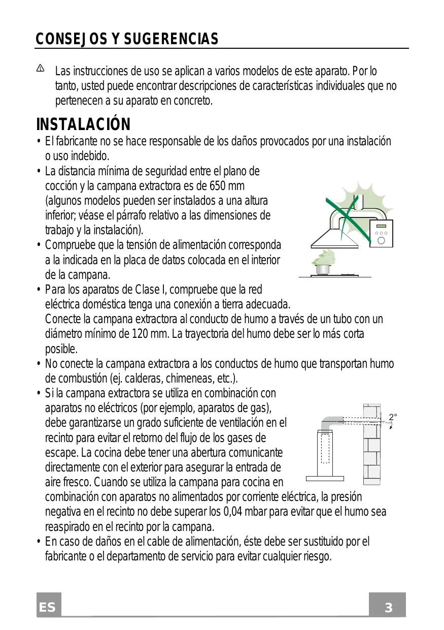- Si la campana extractor se usa en combinación con aparatos no electricos (por exemple, aparatos de gas), deben garantizarse un grado sufICIENTe de ventilación en el recinto para estar el returno del flujo de los gases de escape. La comida debe tener una aberturacomings可以直接amente con el exterior para asegurar la entrada de aire fresco. Cuando se usa la campana para comida en