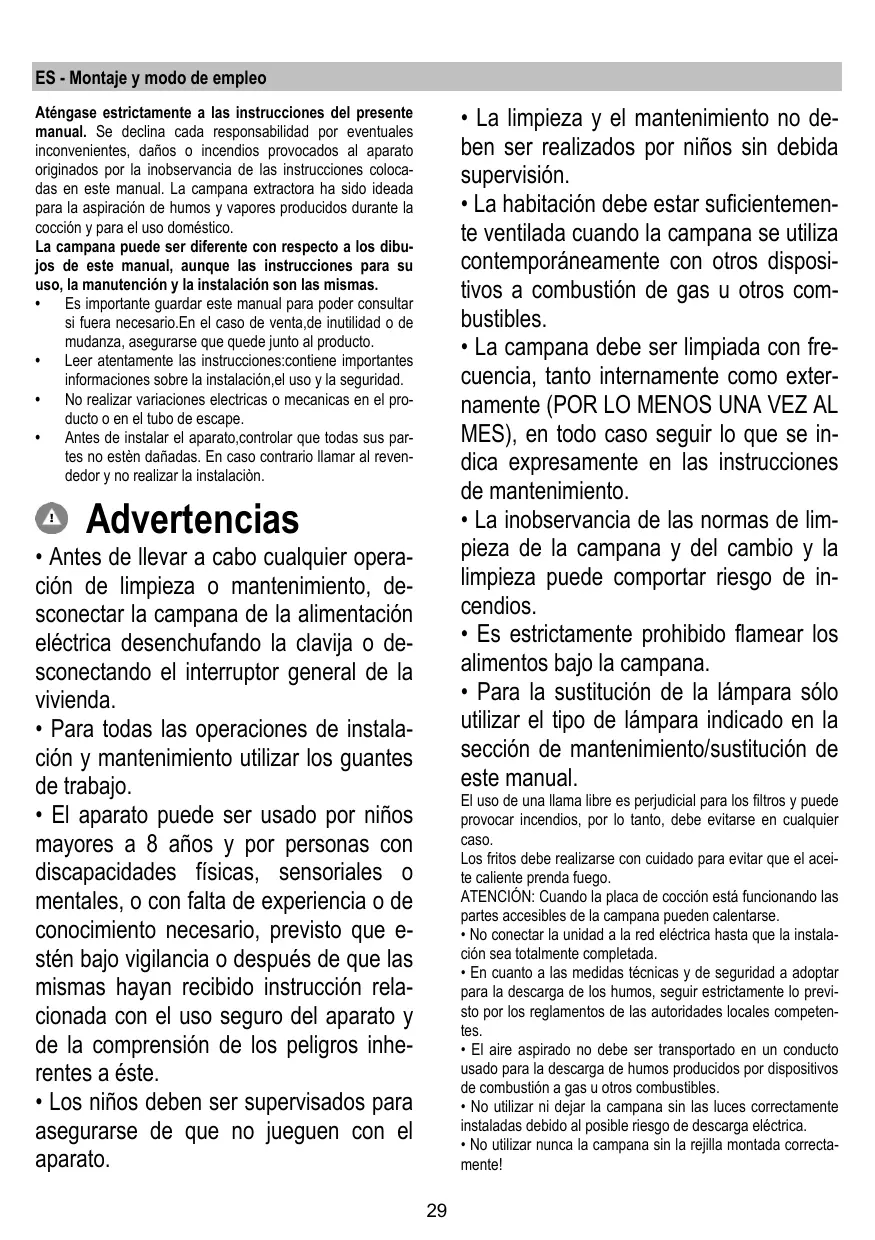 ES - Montaje y modo de empleo Aténgase estrictamente a las instrucciones del presente manual. Se declina cada responsabilidad por eventuales inconvenientes, daños o incendios provocados al aparato originados por la inobservancia de las instrucciones colocadas en este manual. La campana extractora ha sido ideada para la aspiración de humos y vapores producidos durante la cocción y para el uso doméstico. La campana puede ser diferente con respecto a los dibujos de este manual, aunque las instrucciones para su uso, la manutención y la instalación son las mismas.