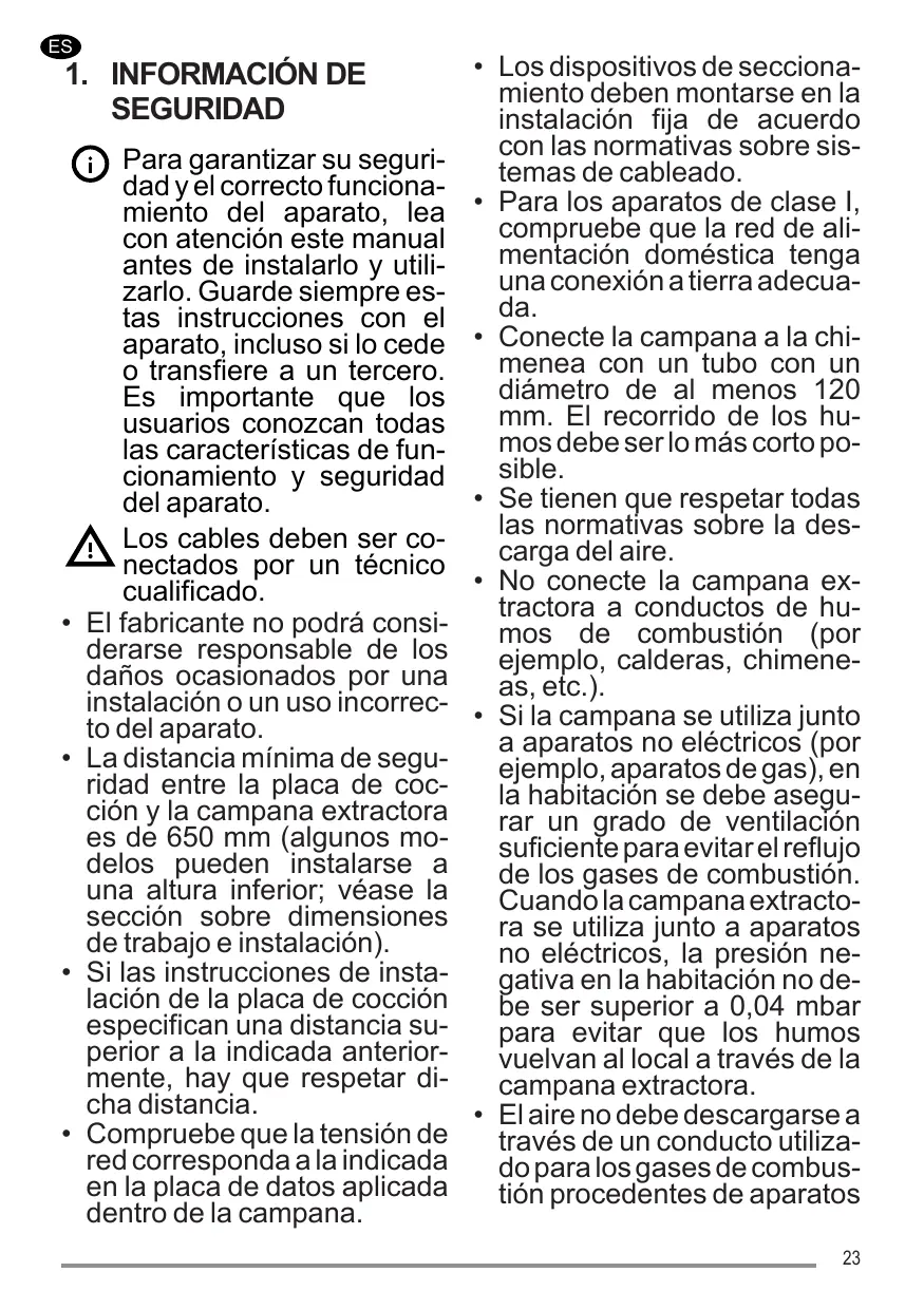 Es importante que los usuarios conozcan todas las características de funcionamiento y seguridad del aparato. Los cables deben ser conectados por un técnico cualificado. El fabricante no podrá considerarse responsable de los daños ocasionados por una instalación o un uso incorrecto del aparato. La distancia mínima de seguridad entre la placa de cocción y la campana extractora es de 650 mm (algunos modelos pueden instalarse a una altura inferior; véase la sección sobre dimensiones de trabajo e instalación). Si las instrucciones de instalación de la placa de cocción especifican una distancia superior a la indicada anteriormente, hay que respetar dicha distancia. Compruebe que la tensión de red corresponda a la indicada en la placa de datos aplicada dentro de la campana.