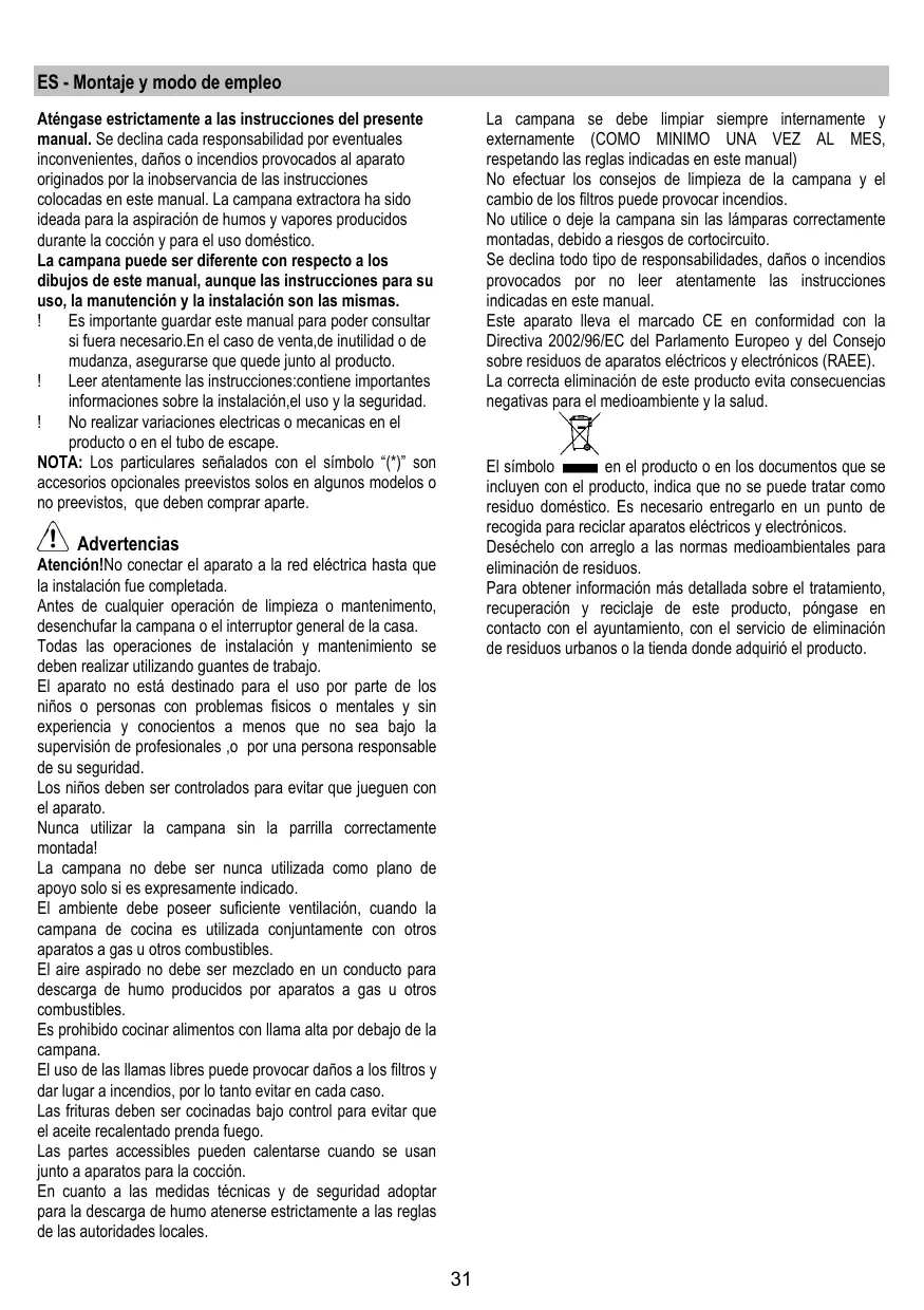 ES - Montaje y modo de empleo La campana se debe limpiar siempre internamente y externamente (COMO MINIMO UNA VEZ AL MES, respetando las reglas indicadas en este manual) No efectuar los consejos de limpieza de la campana y el cambio de los filtros puede provocar incendios. No utilice o deje la campana sin las lámparas correctamente montadas, debido a riesgos de cortocircuito. Se declina todo tipo de responsabilidades, daños o incendios provocados por no leer atentamente las instrucciones indicadas en este manual. Este aparato lleva el marcado CE en conformidad con la Directiva 2002/96/EC del Parlamento Europeo y del Consejo sobre residuos de aparatos eléctricos y electrónicos (RAEE). La correcta eliminación de este producto evita consecuencias negativas para el medioambiente y la salud. Aténgase estrictamente a las instrucciones del presente manual. Se declina cada responsabilidad por eventuales inconvenientes, daños o incendios provocados al aparato originados por la inobservancia de las instrucciones colocadas en este manual. La campana extractora ha sido ideada para la aspiración de humos y vapores producidos durante la cocción y para el uso doméstico. La campana puede ser diferente con respecto a los dibujos de este manual, aunque las instrucciones para su uso, la manutención y la instalación son las mismas. Es importante guardar este manual para poder consultar si fuera necesario.En el caso de venta,de inutilidad o de mudanza, asegurarse que quede junto al producto. Leer atentamente las instrucciones:contiene importantes informaciones sobre la instalación,el uso y la seguridad. No realizar variaciones electricas o mecanicas en el producto o en el tubo de escape. NOTA: Los particulares señalados con el símbolo “(*)” son accesorios opcionales preevistos solos en algunos modelos o no preevistos, que deben comprar aparte. El símbolo en el producto o en los documentos que se incluyen con el producto, indica que no se puede tratar como residuo doméstico. Es necesario entregarlo en un punto de recogida para reciclar aparatos eléctricos y electrónicos. Deséchelo con arreglo a las normas medioambientales para eliminación de residuos. Para obtener información más detallada sobre el tratamiento, recuperación y reciclaje de este producto, póngase en contacto con el ayuntamiento, con el servicio de eliminación de residuos urbanos o la tienda donde adquirió el producto. Advertencias Atención!No conectar el aparato a la red eléctrica hasta que la instalación fue completada. Antes de cualquier operación de limpieza o mantenimento, desenchufar la campana o el interruptor general de la casa. Todas las operaciones de instalación y mantenimiento se deben realizar utilizando guantes de trabajo. El aparato no está destinado para el uso por parte de los niños o personas con problemas fisicos o mentales y sin experiencia y conocientos a menos que no sea bajo la supervisión de profesionales ,o por una persona responsable de su seguridad. Los niños deben ser controlados para evitar que jueguen con el aparato. Nunca utilizar la campana sin la parrilla correctamente montada! La campana no debe ser nunca utilizada como plano de apoyo solo si es expresamente indicado. El ambiente debe poseer suficiente ventilación, cuando la campana de cocina es utilizada conjuntamente con otros aparatos a gas u otros combustibles. El aire aspirado no debe ser mezclado en un conducto para descarga de humo producidos por aparatos a gas u otros combustibles. Es prohibido cocinar alimentos con llama alta por debajo de la campana. El uso de las llamas libres puede provocar daños a los filtros y dar lugar a incendios, por lo tanto evitar en cada caso. Las frituras deben ser cocinadas bajo control para evitar que el aceite recalentado prenda fuego. Las partes accessibles pueden calentarse cuando se usan junto a aparatos para la cocción. En cuanto a las medidas técnicas y de seguridad adoptar para la descarga de humo atenerse estrictamente a las reglas de las autoridades locales.