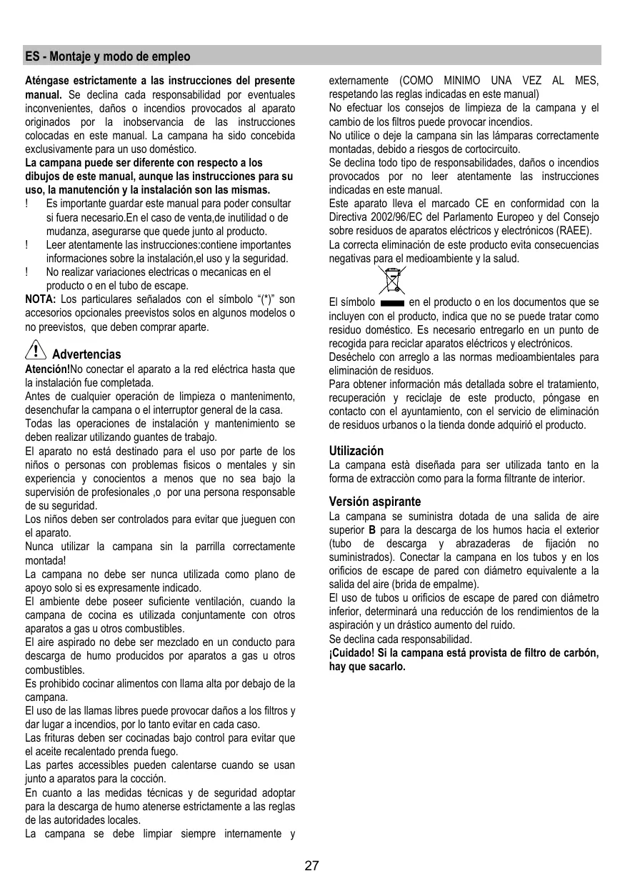 ES - Montaje y modo de empleo externamente (COMO MINIMO UNA VEZ AL MES, respetando las reglas indicadas en este manual) No efectuar los consejos de limpieza de la campana y el cambio de los filtros puede provocar incendios. No utilice o deje la campana sin las lámparas correctamente montadas, debido a riesgos de cortocircuito. Se declina todo tipo de responsabilidades, daños o incendios provocados por no leer atentamente las instrucciones indicadas en este manual. Este aparato lleva el marcado CE en conformidad con la Directiva 2002/96/EC del Parlamento Europeo y del Consejo sobre residuos de aparatos eléctricos y electrónicos (RAEE). La correcta eliminación de este producto evita consecuencias negativas para el medioambiente y la salud.