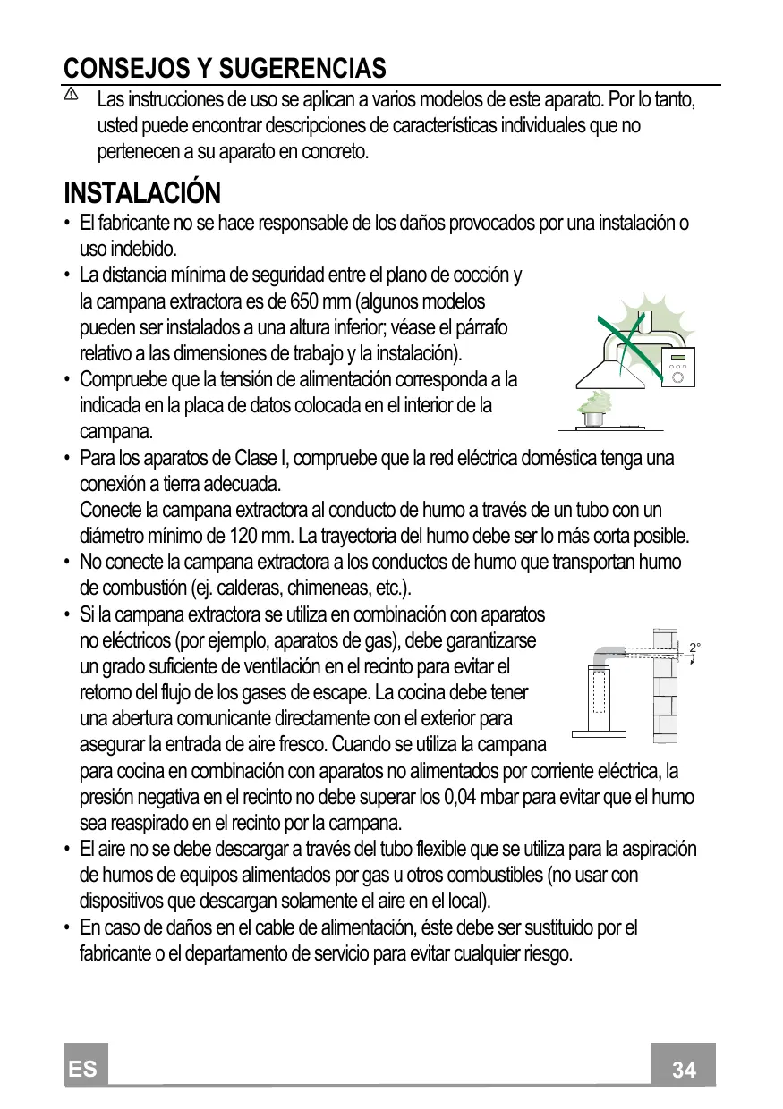 - Si la campana extractora se utiliza en combinación con aparatos no eléctricos (por ejemplo, aparatos de gas), debe garantizarse un grado suficiente de ventilación en el recinto para evitar el retorno del flujo de los gases de escape. La cocina debe tener una abertura comunicante directamente con el exterior para asegurar la entrada de aire fresco. Cuando se utiliza la campana para cocina en combinación con aparatos no alimentados por corriente eléctrica, la presión negativa en el recinto no debe superar los 0,04 mbar para evitar que el humo sea reaspirado en el recinto por la campana.