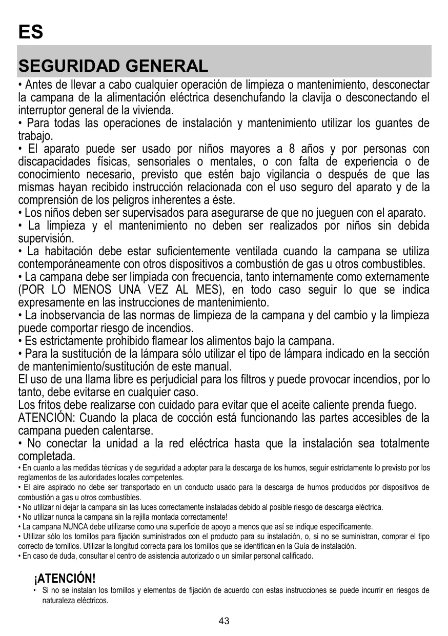 ES SEGURIDAD GENERAL • Antes de llevar a cabo cualquier operación de limpieza o mantenimiento, desconectar la campana de la alimentación eléctrica desenchufando la clavija o desconectando el interruptor general de la vivienda. • Para todas las operaciones de instalación y mantenimiento utilizar los guantes de trabajo. • El aparato puede ser usado por niños mayores a 8 años y por personas con discapacidades físicas, sensoriales o mentales, o con falta de experiencia o de conocimiento necesario, previsto que estén bajo vigilancia o después de que las mismas hayan recibido instrucción relacionada con el uso seguro del aparato y de la comprensión de los peligros inherentes a éste. • Los niños deben ser supervisados para asegurarse de que no jueguen con el aparato. • La limpieza y el mantenimiento no deben ser realizados por niños sin debida supervisión. • La habitación debe estar suficientemente ventilada cuando la campana se utiliza contemporáneamente con otros dispositivos a combustión de gas u otros combustibles. • La campana debe ser limpiada con frecuencia, tanto internamente como externamente (POR LO MENOS UNA VEZ AL MES), en todo caso seguir lo que se indica expresamente en las instrucciones de mantenimiento. • La inobservancia de las normas de limpieza de la campana y del cambio y la limpieza puede comportar riesgo de incendios. • Es estrictamente prohibido flamear los alimentos bajo la campana. • Para la sustitución de la lámpara sólo utilizar el tipo de lámpara indicado en la sección de mantenimiento/sustitución de este manual. El uso de una llama libre es perjudicial para los filtros y puede provocar incendios, por lo tanto, debe evitarse en cualquier caso. Los fritos debe realizarse con cuidado para evitar que el aceite caliente prenda fuego. ATENCIÓN: Cuando la placa de cocción está funcionando las partes accesibles de la campana pueden calentarse. • No conectar la unidad a la red eléctrica hasta que la instalación sea totalmente completada.