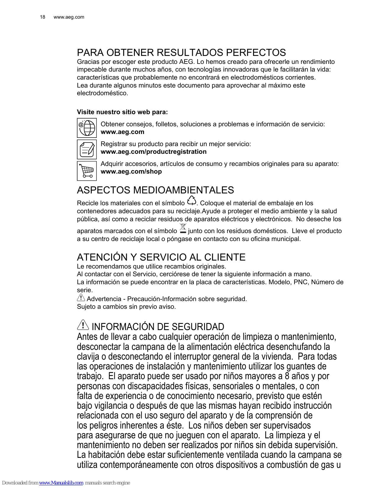 Lea durante algunos minutos este documento para aprovechar al máximo este electrodoméstico. Visite nuestro sitio web para: Obtener consejos, folletos, soluciones a problemas e información de servicio: www.aeg.com Registrar su producto para recibir un mejor servicio: www.aeg.com/productregistration Adquirir accesorios, artículos de consumo y recambios originales para su aparato: www.aeg.com/shop
