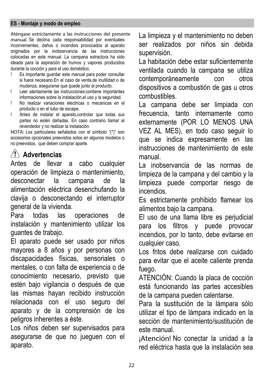 La limpieza y el mantenimiento no deben ser realizados por niños sin debida supervisión. La habitación debe estar suficientemente ventilada cuando la campana se utiliza contemporáneamente con otros dispositivos a combustión de gas u otros combustibles. La campana debe ser limpiada con frecuencia, tanto internamente como externamente (POR LO MENOS UNA VEZ AL MES), en todo caso seguir lo que se indica expresamente en las instrucciones de mantenimiento de este manual. La inobservancia de las normas de limpieza de la campana y del cambio y la limpieza puede comportar riesgo de incendios. Es estrictamente prohibido flamear los alimentos bajo la campana. El uso de una llama libre es perjudicial para los filtros y puede provocar incendios, por lo tanto, debe evitarse en cualquier caso. Los fritos debe realizarse con cuidado para evitar que el aceite caliente prenda fuego. ATENCIÓN: Cuando la placa de cocción está funcionando las partes accesibles de la campana pueden calentarse. Para la sustitución de la lámpara sólo utilizar el tipo de lámpara indicado en la sección de mantenimiento/sustitución de este manual. ¡Atención! No conectar la unidad a la red eléctrica hasta que la instalación sea