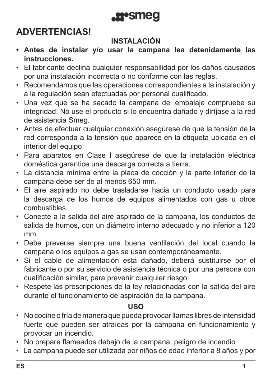 INSTALACIÓN Antes de instalar y/o usar la campana lea detenidamente las instrucciones. El fabricante declina cualquier responsabilidad por los daños causados por una instalación incorrecta o no conforme con las reglas. Recomendamos que las operaciones correspondientes a la instalación y a la regulación sean efectuadas por personal cualificado. Una vez que se ha sacado la campana del embalaje compruebe su integridad. No use el producto si lo encuentra dañado y diríjase a la red de asistencia Smeg. Antes de efectuar cualquier conexión asegúrese de que la tensión de la red corresponda a la tensión que aparece en la etiqueta ubicada en el interior del equipo. Para aparatos en Clase I asegúrese de que la instalación eléctrica doméstica garantice una descarga correcta a tierra. La distancia mínima entre la placa de cocción y la parte inferior de la campana debe ser de al menos 650 mm. El aire aspirado no debe trasladarse hacia un conducto usado para la descarga de los humos de equipos alimentados con gas u otros combustibles. Conecte a la salida del aire aspirado de la campana, los conductos de salida de humos, con un diámetro interno adecuado y no inferior a 120 mm. Debe preverse siempre una buena ventilación del local cuando la campana o los equipos a gas se usan contemporáneamente. Si el cable de alimentación está dañado, deberá sustituirse por el fabricante o por su servicio de asistencia técnica o por una persona con cualificación similar, para prevenir cualquier riesgo. Respete las prescripciones de la ley relacionadas con la salida del aire durante el funcionamiento de aspiración de la campana.