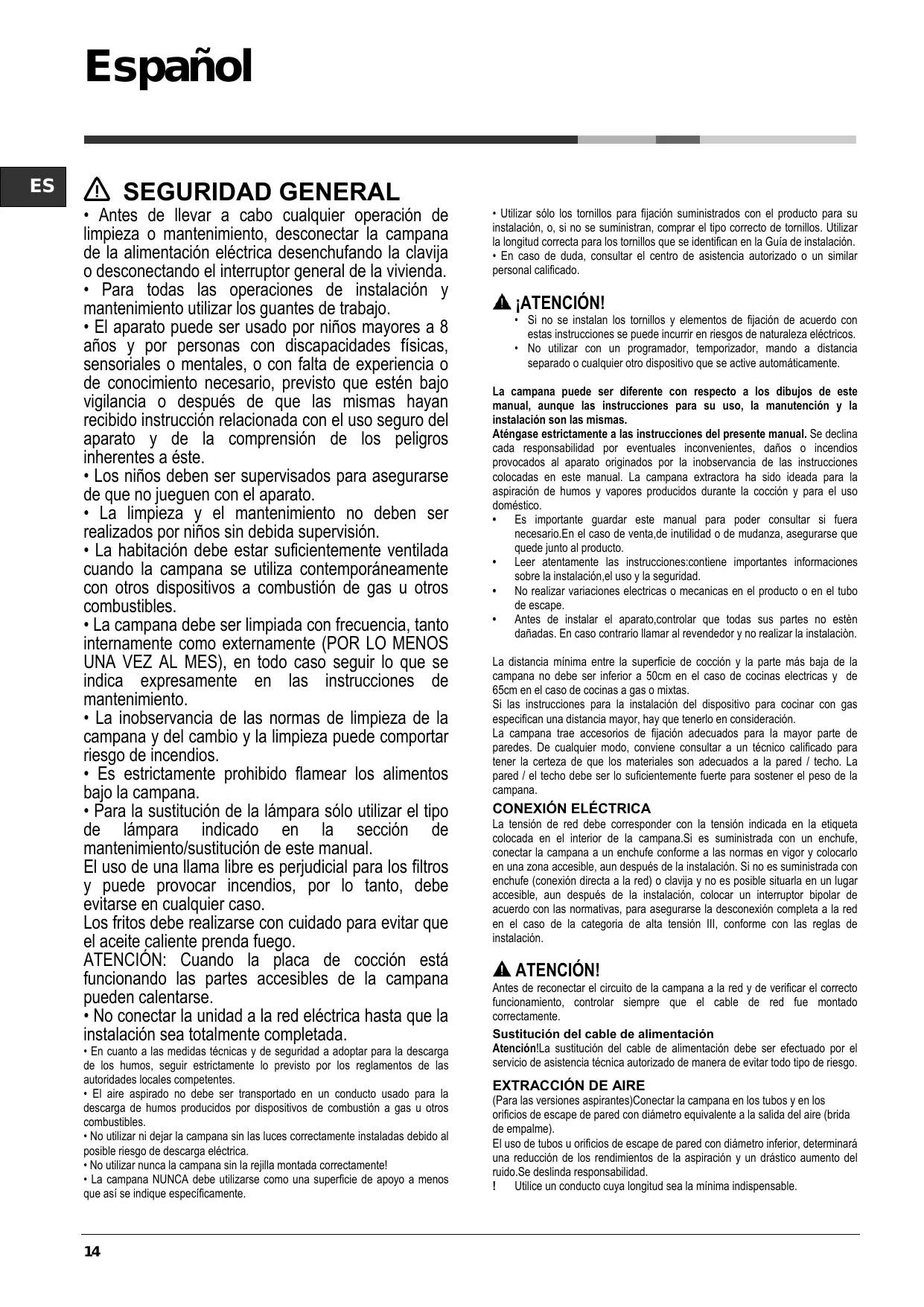 • El aire aspirado no debe ser transportado en un conducto usado para la descarga de humos producidos por dispositivos de combustión a gas u otros combustibles. • No utilizar ni dejar la campana sin las luces correctamente instaladas debido al posible riesgo de descarga eléctrica. • No utilizar nunca la campana sin la rejilla montada correctamente! • La campana NUNCA debe utilizarse como una superficie de apoyo a menos que así se indique específicamente.