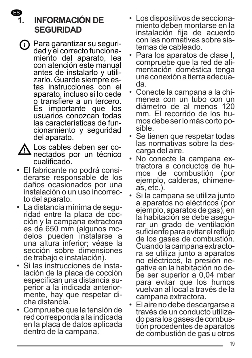 Es importante que los usuarios conozcan todas las características de funcionamiento y seguridad del aparato. Los cables deben ser conectados por un técnico cualificado. El fabricante no podrá considerarse responsable de los daños ocasionados por una instalación o un uso incorrecto del aparato. La distancia mínima de seguridad entre la placa de cocción y la campana extractora es de 650 mm (algunos modelos pueden instalarse a una altura inferior; véase la sección sobre dimensiones de trabajo e instalación). Si las instrucciones de instalación de la placa de cocción especifican una distancia superior a la indicada anteriormente, hay que respetar dicha distancia. Compruebe que la tensión de red corresponda a la indicada en la placa de datos aplicada dentro de la campana.