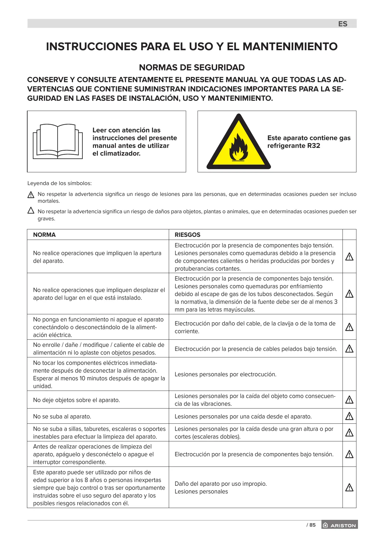 INSTRUCCIONES PARA EL USO Y EL MANTENIMIENTO NORMAS DE SEGURIDAD CONSERVE Y CONSULTE ATENTAMENTE EL PRESENTE MANUAL YA QUE TODAS LAS ADVERTENCIAS QUE CONTIENE SUMINISTRAN INDICACIONES IMPORTANTES PARA LA SEGURIDAD EN LAS FASES DE INSTALACIÓN, USO Y MANTENIMIENTO.
