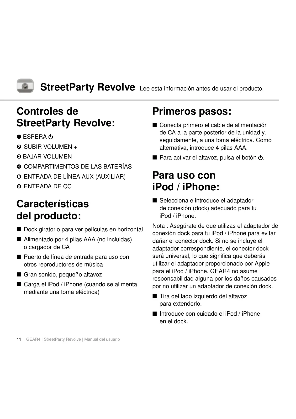 Copyright © 2010 Disruptive Limited. Todos los derechos reservados. Queda prohibida la reproducción total o parcial. GEAR4 y StreetParty son marcas comerciales registradas de Disruptive Limited. iPhone, iPod, iPod nano, iPod classic y iPod touch son marcas comerciales de Apple Inc., registradas en EE.UU. y en otros países. "Made for iPod" y "Made for iPhone" indican que un accesorio electrónico ha sido diseñado específicamente para su conexión a iPod o iPhone y que el fabricante ha certificado el cumplimiento de los estándares de funcionamiento de Apple. Apple no es responsable del funcionamiento de este dispositivo ni de que cumpla las normas de seguridad y las estipulaciones legales. Advertencia Para reducir el riesgo de fuego o descargas eléctricas, no expongas esta unidad a la lluvia o a la humedad. Precaución El empleo de controles o ajustes o la realización de procedimientos distintos a los especificados puede ocasionar una peligrosa exposición a radiaciones. Manual del usuario | StreetParty Revolve | GEAR4