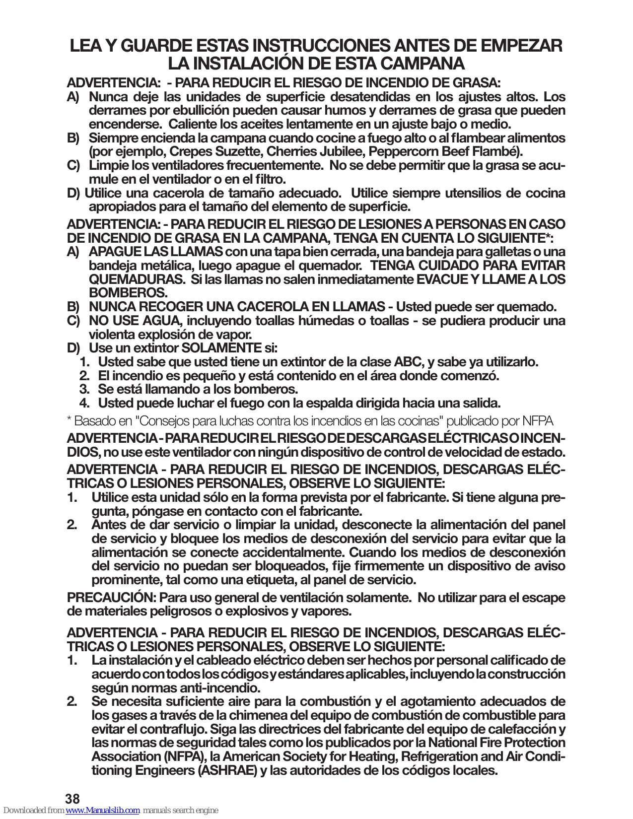 - Basado en "Consejos para luchas contra los incendios en las cocinas" publicado por NFPA ADVERTENCIA - PARA REDUCIR EL RIESGO DE DESCARGAS ELÉCTRICAS O INCENDIOS, no use este ventilador con ningún dispositivo de control de velocidad de estado. ADVERTENCIA - PARA REDUCIR EL RIESGO DE INCENDIOS, DESCARGAS ELÉCTRICAS O LESIONES PERSONALES, OBSERVE LO SIGUIENTE: 1. Utilice esta unidad sólo en la forma prevista por el fabricante. Si tiene alguna pregunta, póngase en contacto con el fabricante.