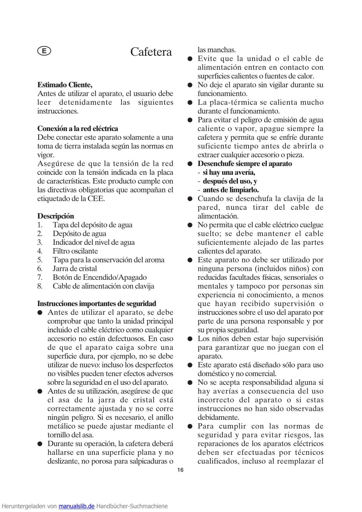 Evite que la unidad o el cable de alimentación entren en contacto con superficies calientes o fuentes de calor. No deje el aparato sin vigilar durante su funcionamiento. La placa-térmica se calienta mucho durante el funcionamiento. Para evitar el peligro de emisión de agua caliente o vapor, apague siempre la cafetera y permita que se enfríe durante suficiente tiempo antes de abrirla o extraer cualquier accesorio o pieza. Desenchufe siempre el aparato - si hay una avería, - después del uso, y - antes de limpiarlo. Cuando se desenchufa la clavija de la pared, nunca tirar del cable de alimentación. No permita que el cable eléctrico cuelgue suelto; se debe mantener el cable suficientemente alejado de las partes calientes del aparato. Este aparato no debe ser utilizado por ninguna persona (incluidos niños) con reducidas facultades físicas, sensoriales o mentales y tampoco por personas sin experiencia ni conocimiento, a menos que hayan recibido supervisión o instrucciones sobre el uso del aparato por parte de una persona responsable y por su propia seguridad. Los niños deben estar bajo supervisión para garantizar que no juegan con el aparato. Este aparato está diseñado sólo para uso doméstico y no comercial. No se acepta responsabilidad alguna si hay averías a consecuencia del uso incorrecto del aparato o si estas instrucciones no han sido observadas debidamente. Para cumplir con las normas de seguridad y para evitar riesgos, las reparaciones de los aparatos eléctricos deben ser efectuadas por técnicos cualificados, incluso al reemplazar el
