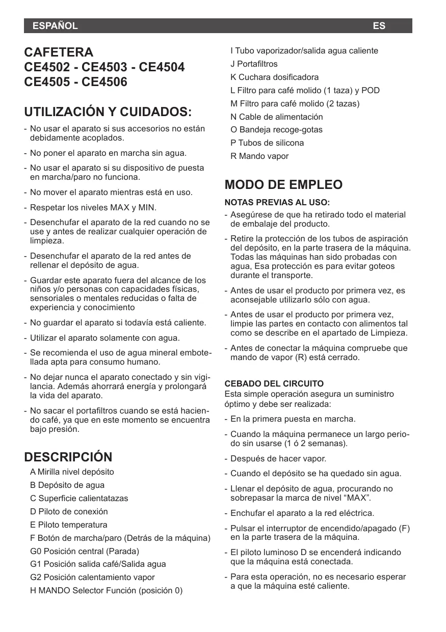 CAFETERA CE4502 - CE4503 - CE4504 CE4505 - CE4506 UTILIZACIÓN Y CUIDADOS: