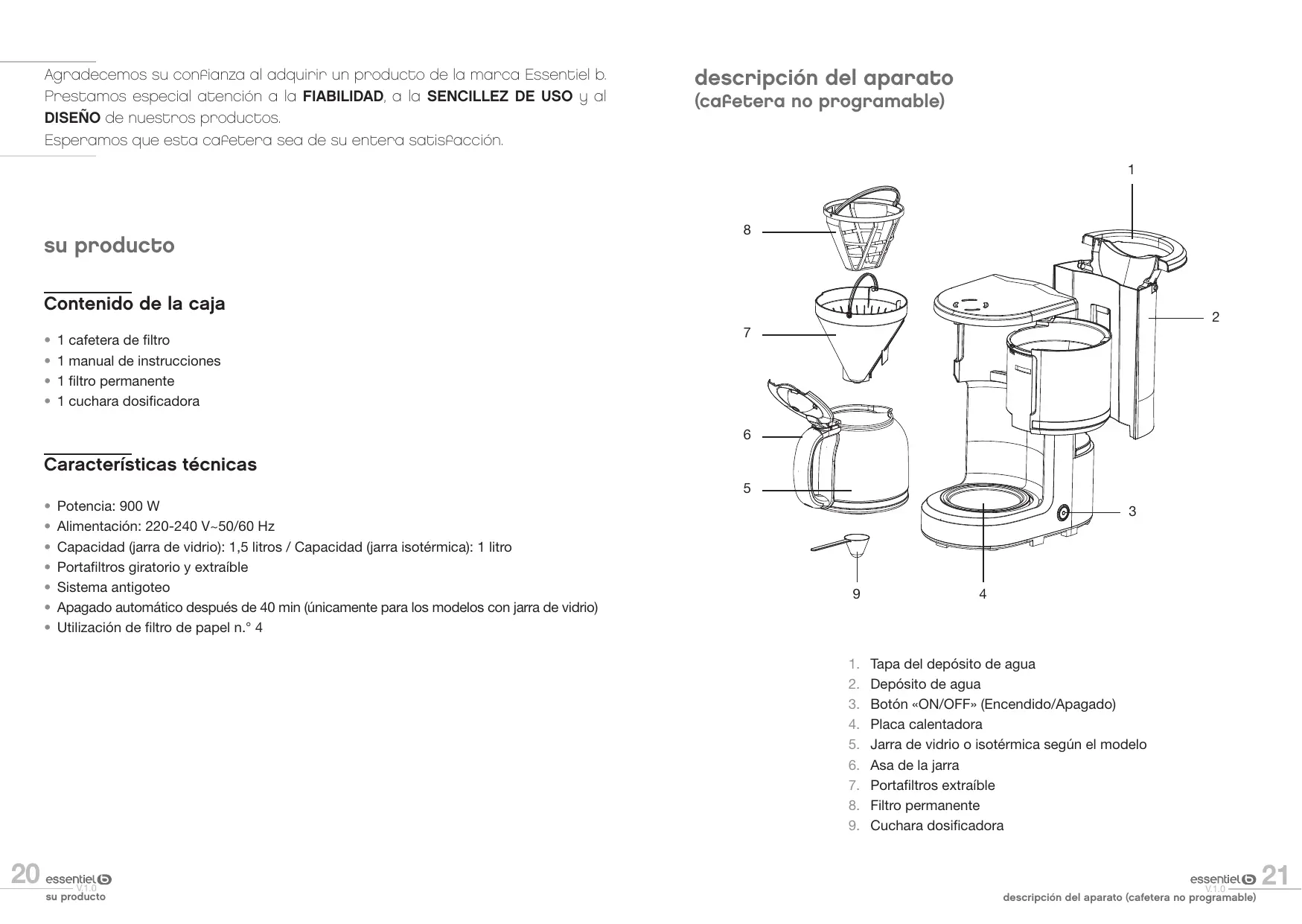 1 manual de instrucciones 1 filtro permanente 1 cuchara dosificadora