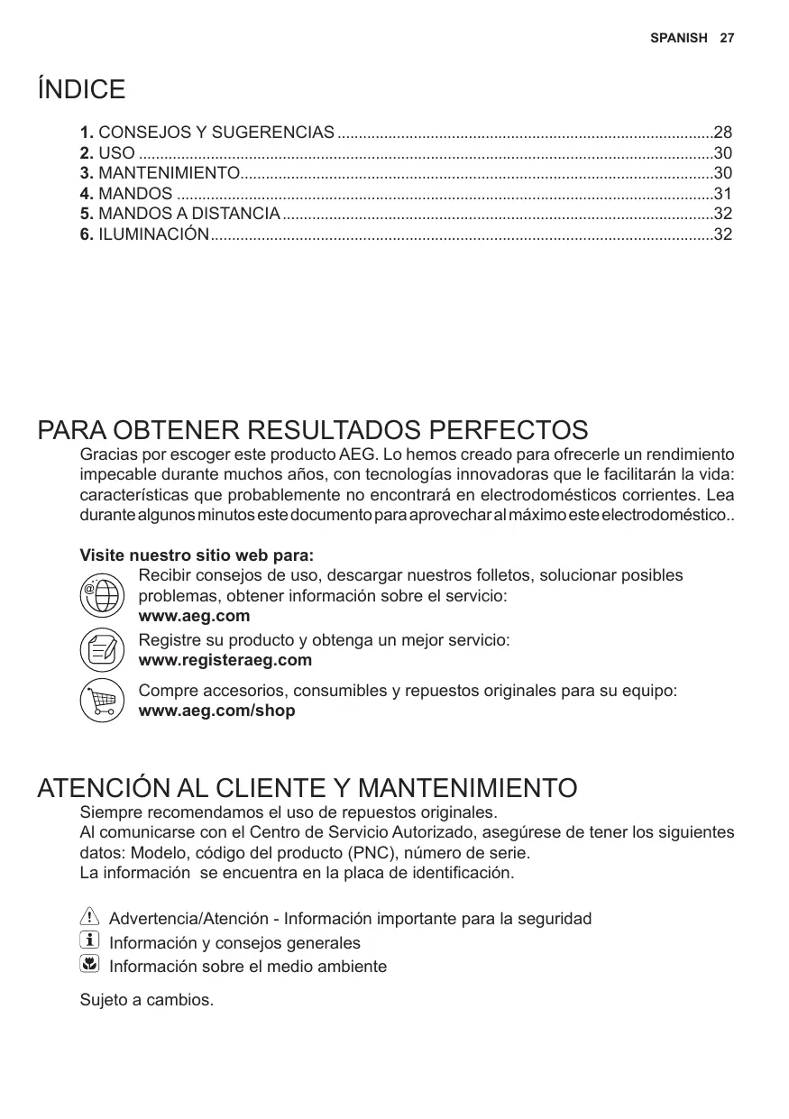 Siempre recomendamos el uso de repuestos originales. Al comunicarse con el Centro de Servicio Autorizado, asegúrese de tener los siguientes datos: Modelo, código del producto (PNC), número de serie. La información se encuentra en la placa de identificación. Advertencia/Atención - Información importante para la seguridad Información y consejos generales Información sobre el medio ambiente Sujeto a cambios. 28 www.aeg.com