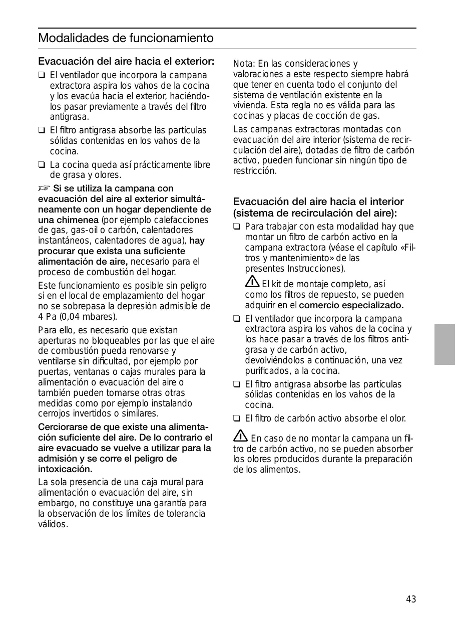 (sistema de recirculación del aire): ❑ Para trabajar con esta modalidad hay que montar un filtro de carbón activo en la campana extractora (véase el capítulo «Filtros y mantenimiento» de las presentes Instrucciones).