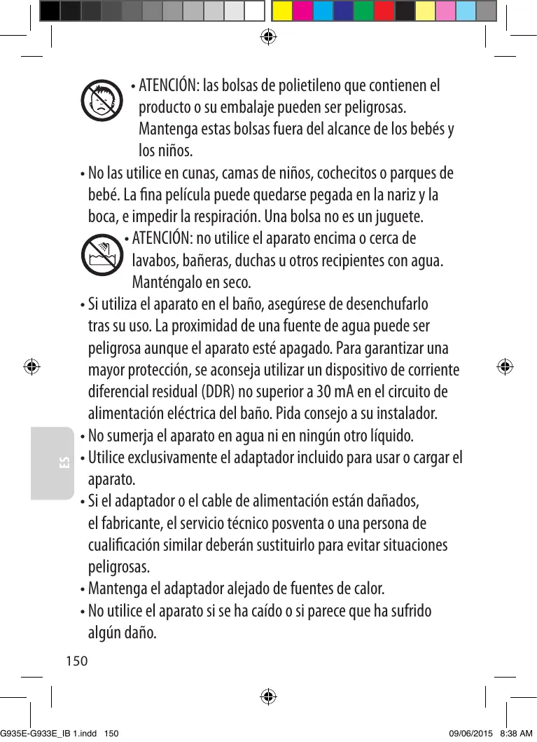 • Ne pas les utiliser dans les berceaux, les lits d’enfants, les poussettes ou les parcs pour bébés. Le fin film peut coller au nez et à la bouche et empêcher la respiration. Un sachet n’est pas un jouet. • ATTENTION: ne pas utiliser au-dessus ou à proximité de lavabos, baignoires, douches ou autres récipients contenant de l’eau. Maintenir l’appareil au sec. • En cas d’utilisation de l’appareil dans une salle de bain, veillez à le débrancher après vous en être servi. En effet, la proximité d’une source d’eau peut être dangereuse même si l’appareil est éteint. Pour assurer une protection complémentaire, l’installation, dans le circuit électrique alimentant la salle de bain, d’un dispositif à courant différentiel résiduel (DDR) de courant différentiel de fonctionnement assigné n’excédant pas 30mA, est conseillée. Demandez conseil à votre installateur. • Ne plongez pas l’appareil dans l’eau ou dans tout autre liquide. • Utiliser exclusivement l’adaptateur fourni pour utiliser ou charger l’appareil. • Si l’adaptateur ou le cordon d’alimentation est endommagé, il doit être remplacé par le fabricant, son service après vente ou des personnes de qualification similaire afin d’éviter un danger. • Maintenez l’adaptateur à distance de toute source de chaleur. 5