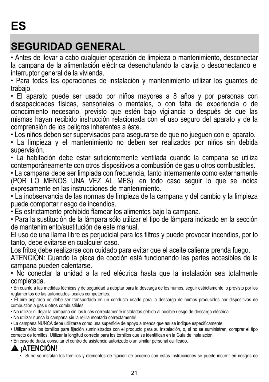 • Para la sustitución de la lámpara sólo utilizar el tipo de lámpara indicado en la sección de mantenimiento/sustitución de este manual. El uso de una llama libre es perjudicial para los filtros y puede provocar incendios, por lo tanto, debe evitarse en cualquier caso. Los fritos debe realizarse con cuidado para evitar que el aceite caliente prenda fuego. ATENCIÓN: Cuando la placa de cocción está funcionando las partes accesibles de la campana pueden calentarse.