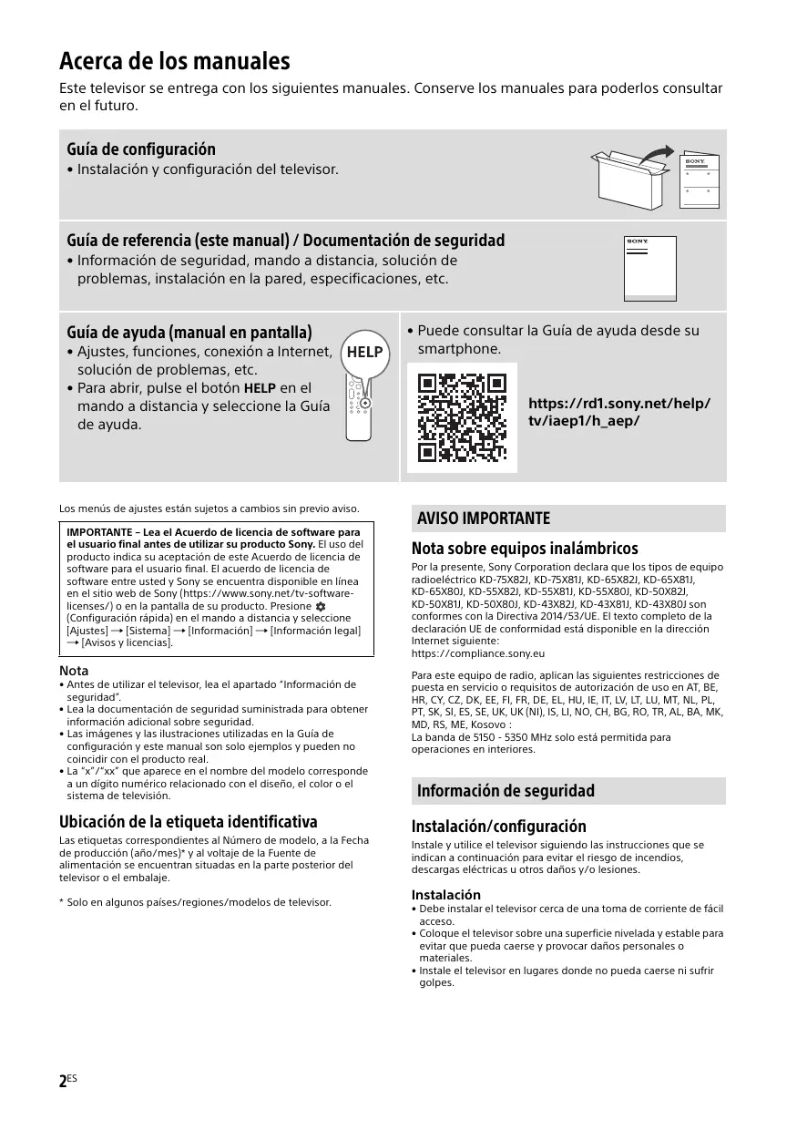 Por la presente, Sony Corporation declara que los tipos de equipo radioeléctrico KD-75X82J, KD-75X81J, KD-65X82J, KD-65X81J, KD-65X80J, KD-55X82J, KD-55X81J, KD-55X80J, KD-50X82J, KD-50X81J, KD-50X80J, KD-43X82J, KD-43X81J, KD-43X80J son conformes con la Directiva 2014/53/UE. El texto completo de la declaración UE de conformidad está disponible en la dirección Internet siguiente: https://compliance.sony.eu Para este equipo de radio, aplican las siguientes restricciones de puesta en servicio o requisitos de autorización de uso en AT, BE, HR, CY, CZ, DK, EE, FI, FR, DE, EL, HU, IE, IT, LV, LT, LU, MT, NL, PL, PT, SK, SI, ES, SE, UK, UK (NI), IS, LI, NO, CH, BG, RO, TR, AL, BA, MK, MD, RS, ME, Kosovo : La banda de 5150 - 5350 MHz solo está permitida para operaciones en interiores.