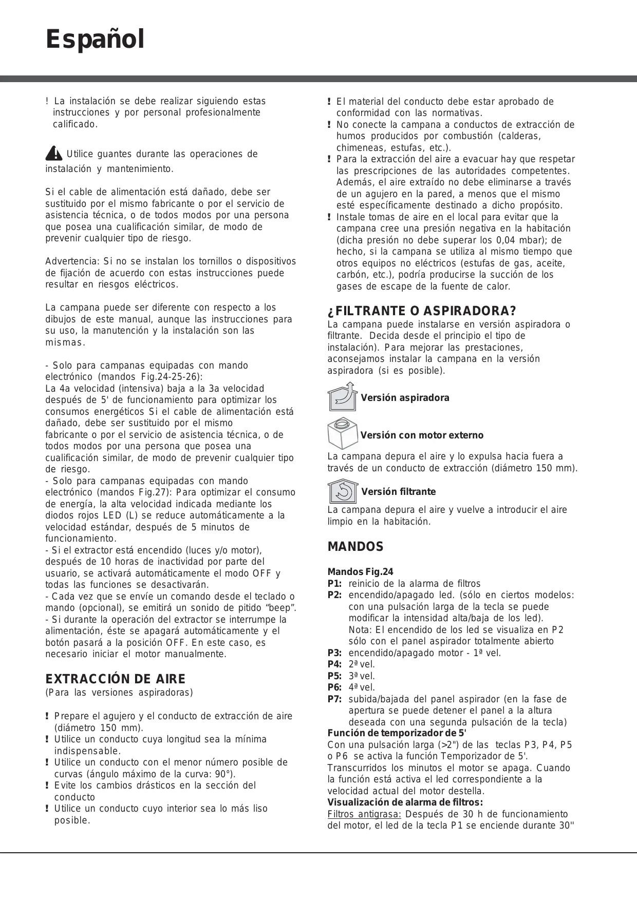 Solo para campanas equipadas con mando electrónico (mandos Fig.24-25-26): La 4a velocidad (intensa) baja a la 3a velocidad después de 5^ de funciona bajo el meismo消耗ables. Fabricante o por el service de asistencia技术水平, o de todosodos por una persona que posea una calidad similar, de modo de prevenirrialquier tipo de riesgo.