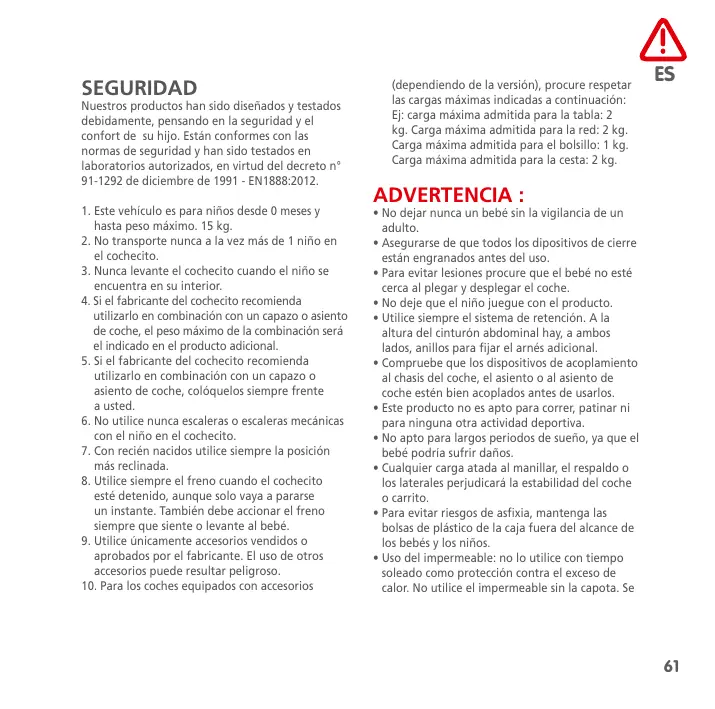 Nuestros productos han sido diseñados y testados debidamente, pensando en la seguridad y el confort de su hijo. Están conformes con las normas de seguridad y han sido testados en laboratorios autorizados, en virtud del decreto n° 91-1292 de diciembre de 1991 - EN1888:2012.