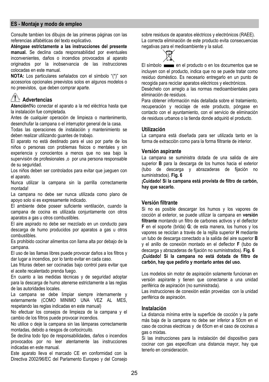 Si no es posible descargar los humos y los vapores de cocción al exterior, se puede utilizar la campana en versión filtrante montando un filtro de carbones activos y el deflector F en el soporte (brida) G; de esta manera, los humos y los vapores se reciclan a través de la rejilla superior H mediante un tubo de descarga conectado a la salida del aire superior B y el anillo de conexión montado en el deflector F (tubo de descarga y abrazaderas de fijación no suministrados). Fig. 6 ¡Cuidado! Si la campana no está dotada de filtro de carbón, hay que pedirlo y montarlo antes del uso. Los modelos sin motor de aspiración solamente funcionan en versión aspirante y tienen que conectarse a una unidad periférica de aspiración (no suministrada). Las instrucciones de conexión estàn proveidas con la unidad periférica de aspiración.