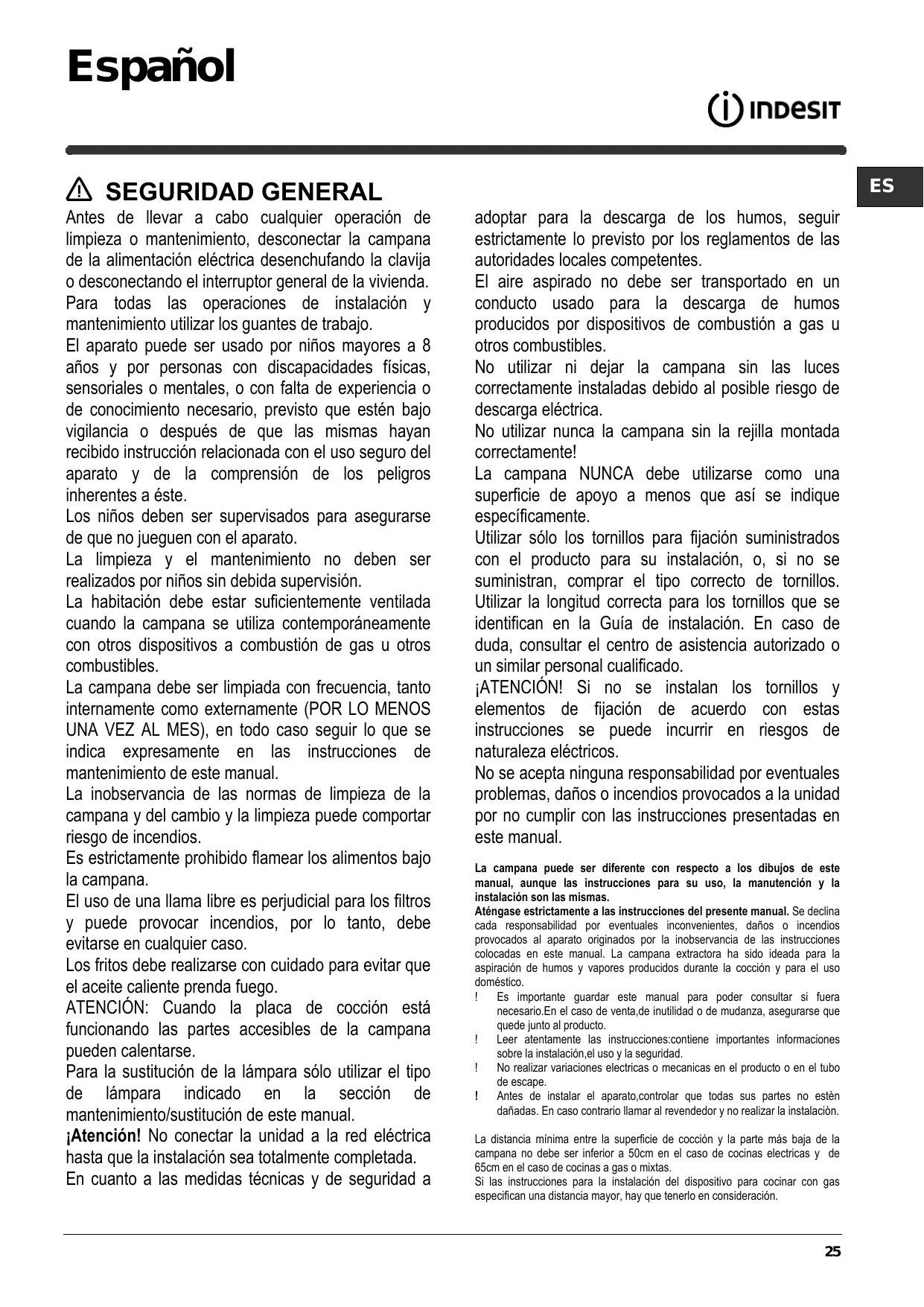 El aire aspirado no debe ser transportado en un conducto usado para la descarga de humos producidos por dispositivos de combustión a gas u otros combustibles. No utilizar ni dejar la campana sin las luces correctamente instaladas debido al posible riesgo de descarga eléctrica. No utilizar nunca la campana sin la rejilla montada correctamente! La campana NUNCA debe utilizarse como una superficie de apoyo a menos que así se indique específicamente. Utilizar sólo los tornillos para fijación suministrados con el producto para su instalación, o, si no se suministran, comprar el tipo correcto de tornillos. Utilizar la longitud correcta para los tornillos que se identifican en la Guía de instalación. En caso de duda, consultar el centro de asistencia autorizado o un similar personal cualificado. ¡ATENCIÓN! Si no se instalan los tornillos y elementos de fijación de acuerdo con estas instrucciones se puede incurrir en riesgos de naturaleza eléctricos. No se acepta ninguna responsabilidad por eventuales problemas, daños o incendios provocados a la unidad por no cumplir con las instrucciones presentadas en este manual. La campana puede ser diferente con respecto a los dibujos de este manual, aunque las instrucciones para su uso, la manutención y la instalación son las mismas. Aténgase estrictamente a las instrucciones del presente manual. Se declina cada responsabilidad por eventuales inconvenientes, daños o incendios provocados al aparato originados por la inobservancia de las instrucciones colocadas en este manual. La campana extractora ha sido ideada para la aspiración de humos y vapores producidos durante la cocción y para el uso doméstico. ! Es importante guardar este manual para poder consultar si fuera necesario.En el caso de venta,de inutilidad o de mudanza, asegurarse que quede junto al producto. La campana está provista de un cable de alimentación especial; si el cable se daña, solicite uno nuevo al Servicio de Asistencia Técnica.