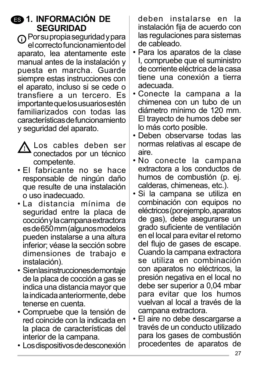 Para los aparatos de la clase I, compruebe que el suministro de corriente eléctrica de la casa tiene una conexión a tierra adecuada. Conecte la campana a la chimenea con un tubo de un diámetro mínimo de 120 mm. El trayecto de humos debe ser lo más corto posible. Deben observarse todas las normas relativas al escape de aire. No conecte la campana extractora a los conductos de humos de combustión (p. ej. calderas, chimeneas, etc.). Si la campana se utiliza en combinación con equipos no eléctricos (por ejemplo, aparatos de gas), debe asegurarse un grado suficiente de ventilación en el local para evitar el retorno del flujo de gases de escape. Cuando la campana extractora se utiliza en combinación con aparatos no eléctricos, la presión negativa en el local no debe ser superior a 0,04 mbar para evitar que los humos vuelvan al local a través de la campana extractora. El aire no debe descargarse a través de un conducto utilizado para los gases de combustión procedentes de aparatos de 27