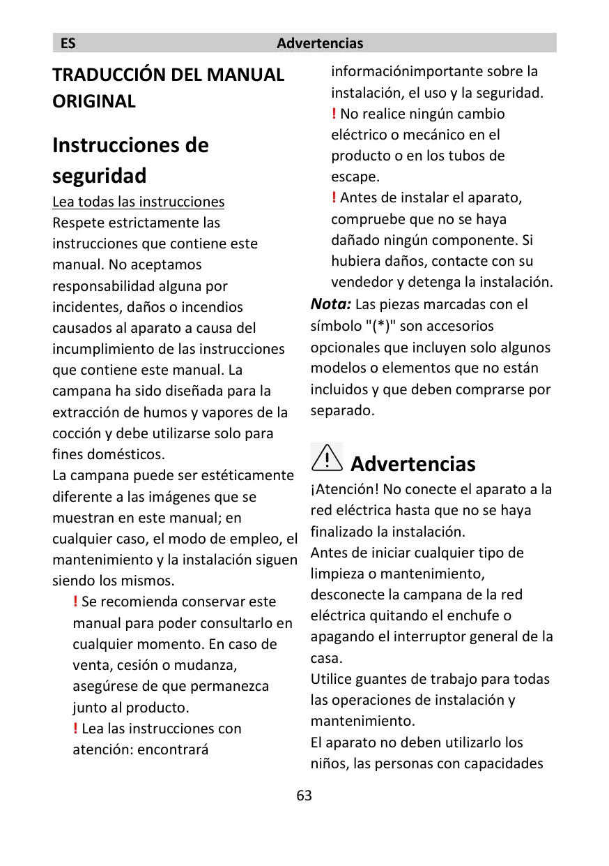 Lea todas las instrucciones Respete estrictamente las instrucciones que contiene este manual. No aceptamos responsabilidad alguna por incidentes, daños o incendios causados al aparato a causa del incumplimiento de las instrucciones que contiene este manual. La campana ha sido diseñada para la extracción de humos y vapores de la cocción y debe utilizarse solo para fines domésticos. La campana puede ser estéticamente diferente a las imágenes que se muestran en este manual; en cualquier caso, el modo de empleo, el mantenimiento y la instalación siguen siendo los mismos. ! Se recomienda conservar este manual para poder consultarlo en cualquier momento. En caso de venta, cesión o mudanza, asegúrese de que permanezca junto al producto. ! Lea las instrucciones con atención: encontrará