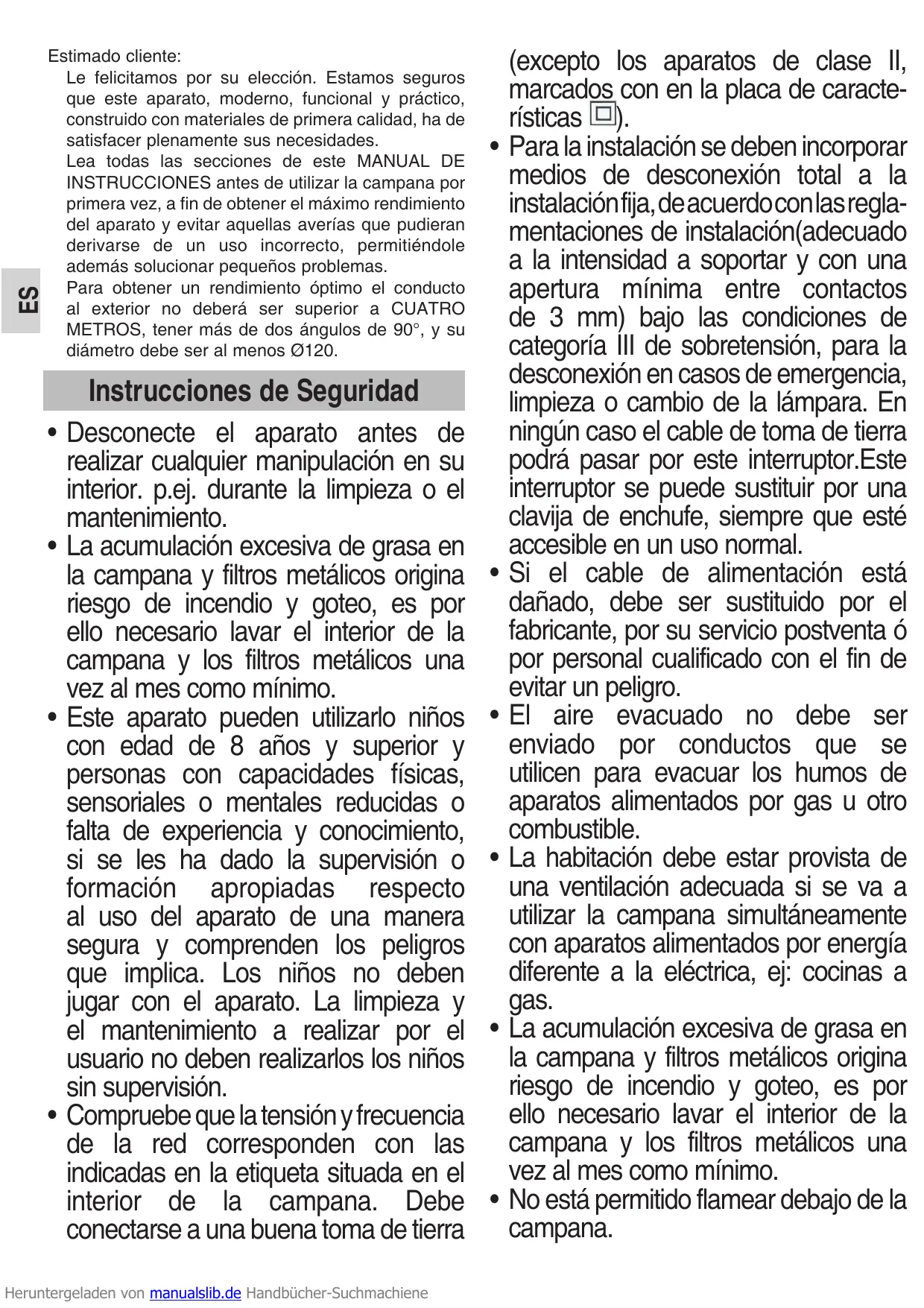 • Desconecte el aparato antes de realizar cualquier manipulación en su interior. p.ej. durante la limpieza o el mantenimiento. • La acumulación excesiva de grasa en la campana y filtros metálicos origina riesgo de incendio y goteo, es por ello necesario lavar el interior de la campana y los filtros metálicos una vez al mes como mínimo. • Este aparato pueden utilizarlo niños con edad de 8 años y superior y personas con capacidades físicas, sensoriales o mentales reducidas o falta de experiencia y conocimiento, si se les ha dado la supervisión o formación apropiadas respecto al uso del aparato de una manera segura y comprenden los peligros que implica. Los niños no deben jugar con el aparato. La limpieza y el mantenimiento a realizar por el usuario no deben realizarlos los niños sin supervisión. • Compruebe que la tensión y frecuencia de la red corresponden con las indicadas en la etiqueta situada en el interior de la campana. Debe conectarse a una buena toma de tierra Heruntergeladen von manualslib.de Handbücher-Suchmachiene