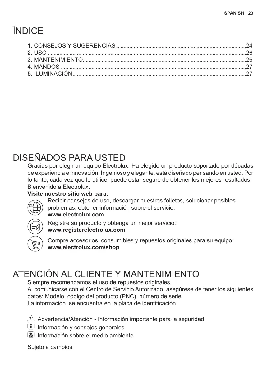 Gracias por elegir un equipo Electrolux. Ha elegido un producto soportado por décadas de experiencia e innovación. Ingenioso y elegante, está diseñado pensando en usted. Por lo tanto, cada vez que lo utilice, puede estar seguro de obtener los mejores resultados. Bienvenido a Electrolux. Visite nuestro sitio web para: Recibir consejos de uso, descargar nuestros folletos, solucionar posibles problemas, obtener información sobre el servicio: www.electrolux.com Registre su producto y obtenga un mejor servicio: www.registerelectrolux.com Compre accesorios, consumibles y repuestos originales para su equipo: www.electrolux.com/shop