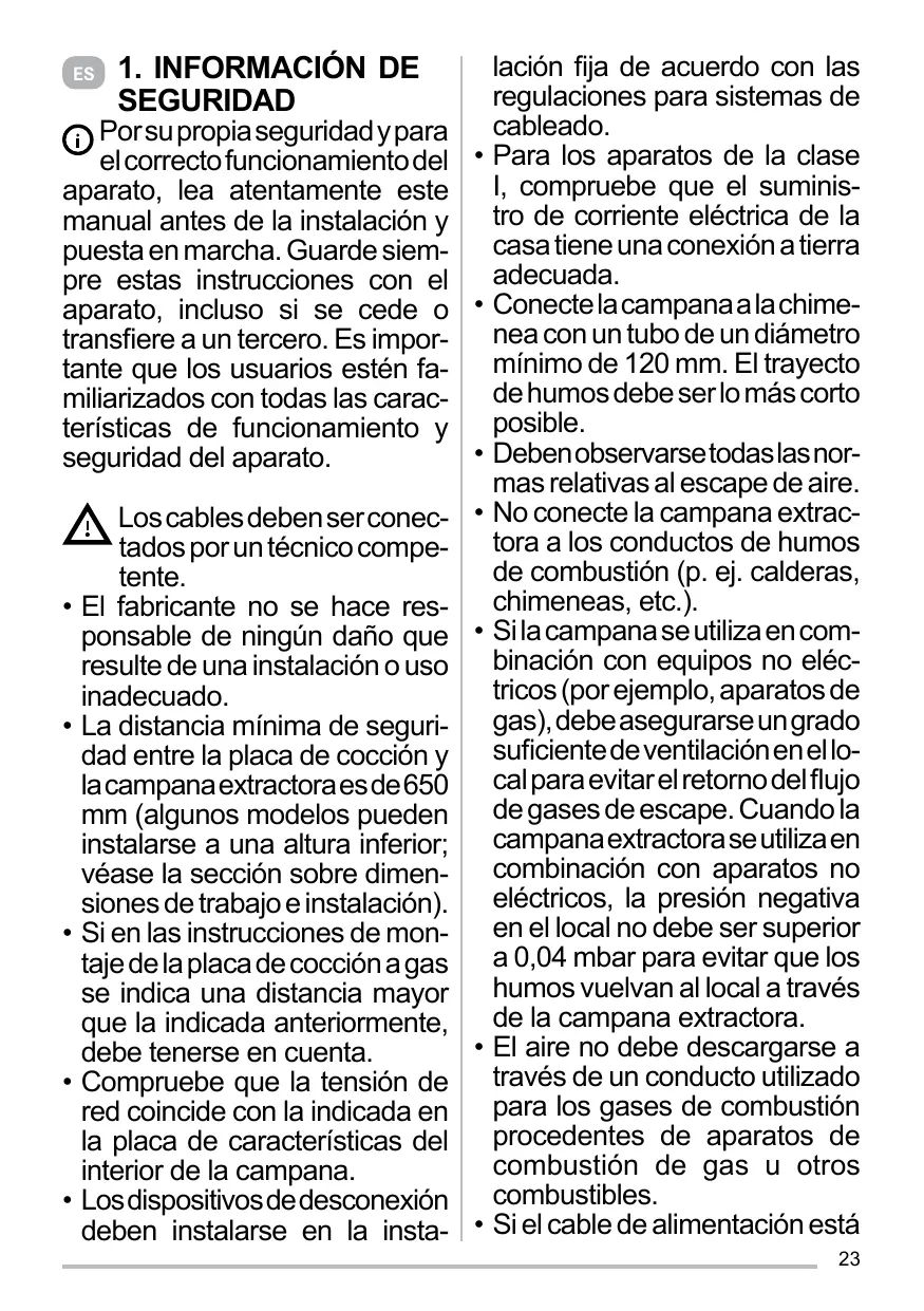 Para los aparatos de la clase I, compruebe que el suministro de corriente eléctrica de la casa tiene una conexión a tierra adecuada. Conecte la campana a la chimenea con un tubo de un diámetro mínimo de 120 mm. El trayecto de humos debe ser lo más corto posible. Deben observarse todas las normas relativas al escape de aire. No conecte la campana extractora a los conductos de humos de combustión (p. ej. calderas, chimeneas, etc.). Si la campana se utiliza en combinación con equipos no eléctricos (por ejemplo, aparatos de gas), debe asegurarse un grado suficiente de ventilación en el local para evitar el retorno del flujo de gases de escape. Cuando la campana extractora se utiliza en combinación con aparatos no eléctricos, la presión negativa en el local no debe ser superior a 0,04 mbar para evitar que los humos vuelvan al local a través de la campana extractora. El aire no debe descargarse a través de un conducto utilizado para los gases de combustión procedentes de aparatos de combustión de gas u otros combustibles. Si el cable de alimentación está 23
