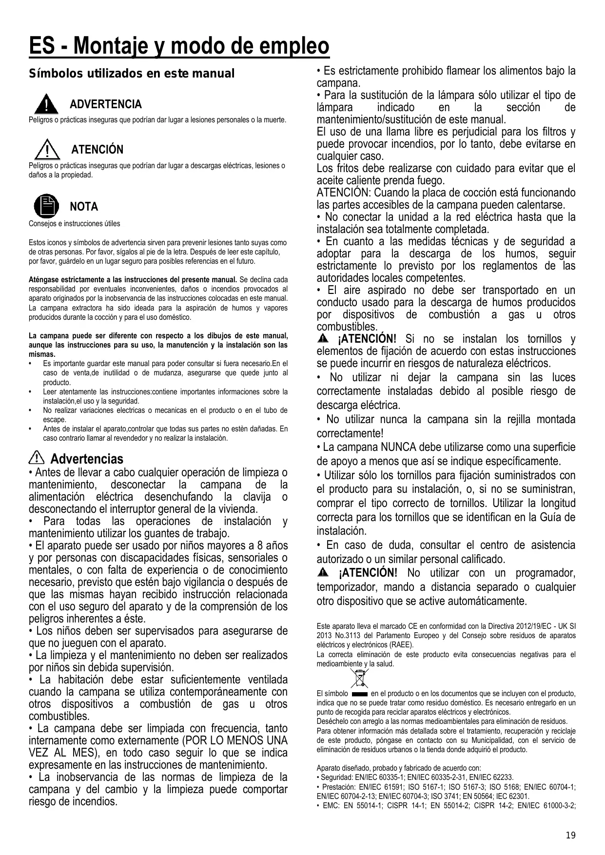 • Para la sustitución de la lámpara sólo utilizar el tipo de lámpara indicado en la sección de mantenimiento/sustitución de este manual. El uso de una llama libre es perjudicial para los filtros y puede provocar incendios, por lo tanto, debe evitarse en cualquier caso. Los fritos debe realizarse con cuidado para evitar que el aceite caliente prenda fuego. ATENCIÓN: Cuando la placa de cocción está funcionando las partes accesibles de la campana pueden calentarse. • No conectar la unidad a la red eléctrica hasta que la instalación sea totalmente completada. • En cuanto a las medidas técnicas y de seguridad a adoptar para la descarga de los humos, seguir estrictamente lo previsto por los reglamentos de las autoridades locales competentes. • El aire aspirado no debe ser transportado en un conducto usado para la descarga de humos producidos por dispositivos de combustión a gas u otros combustibles. ¡ATENCIÓN! Si no se instalan los tornillos y elementos de fijación de acuerdo con estas instrucciones se puede incurrir en riesgos de naturaleza eléctricos. • No utilizar ni dejar la campana sin las luces correctamente instaladas debido al posible riesgo de descarga eléctrica. • No utilizar nunca la campana sin la rejilla montada correctamente! • La campana NUNCA debe utilizarse como una superficie de apoyo a menos que así se indique específicamente. • Utilizar sólo los tornillos para fijación suministrados con el producto para su instalación, o, si no se suministran, comprar el tipo correcto de tornillos. Utilizar la longitud correcta para los tornillos que se identifican en la Guía de instalación. • En caso de duda, consultar el centro de asistencia autorizado o un similar personal calificado. ¡ATENCIÓN! No utilizar con un programador, temporizador, mando a distancia separado o cualquier otro dispositivo que se active automáticamente. Este aparato lleva el marcado CE en conformidad con la Directiva 2012/19/EC - UK SI 2013 No.3113 del Parlamento Europeo y del Consejo sobre residuos de aparatos eléctricos y electrónicos (RAEE). La correcta eliminación de este producto evita consecuencias negativas para el medioambiente y la salud.