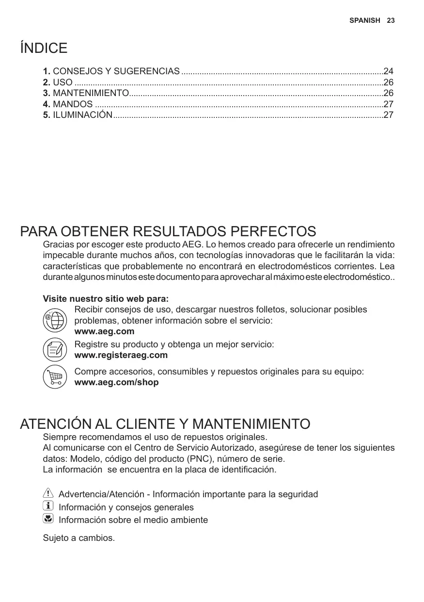 Visite nuestro sitio web para: Recibir consejos de uso, descargar nuestros folletos, solucionar posibles problemas, obtener información sobre el servicio: www.aeg.com Registre su producto y obtenga un mejor servicio: www.registeraeg.com Compre accesorios, consumibles y repuestos originales para su equipo: www.aeg.com/shop