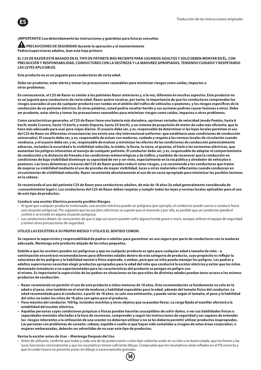 Este producto no es un juguete para conductores de corta edad. Debe ser prudente, estar alerta y tomar las precauciones razonables para minimizar riesgos como caídas, impactos u otros problemas. En consecuencia, el C25 de Razor es similar a los patinetes Razor anteriores y, a la vez, diferente en muchos aspectos. Este producto no es un juguete para conductores de corta edad. Razor quiere recalcar, por tanto, la importancia de que los conductores comprendan los riesgos asociados al uso de cualquier producto con ruedas en el ámbito del tráfico de vehículos o peatones, y los riesgos específicos de la conducción de un patinete eléctrico. En otras palabras, usted podría resultar herido y sus acciones podrían causar lesiones a otros. Debe ser prudente, estar alerta y tomar las precauciones razonables para minimizar riesgos como caídas, impactos u otros problemas. Como características generales, el C25 de Razor tiene una batería más duradera, opciones variadas de velocidad (modo Peatón, hasta 6 km/h; modo Crucero, hasta 15 km/h; y modo Deporte, hasta 25 km/h), y un sistema de propulsión de motor de cubo más eficiente, que lo hace más adecuado para usar para viajes diarios. El usuario debe ser, y es, responsable de determinar si las leyes locales permiten el uso del C25 de Razor en diferentes circunstancias (no existe una «ley internacional uniforme» que establezca unas condiciones de conducción universales). El usuario debe ser, y es, responsable de actuar con madurez, cuidado y respeto a las normas locales de circulación cuando conduzca, y el usuario debe ser, y es, responsable de evaluar y minimizar los efectos de las condiciones de conducción potencialmente adversas, incluidos la oscuridad o la visibilidad reducida, la niebla, la lluvia, la nieve, el granizo, el hielo o las tormentas eléctricas, que aumentan los peligros inherentes al manejo de cualquier patinete. El conductor debe ser, y es, responsable de adaptar el comportamiento de conducción y la distancia de frenado a las condiciones meteorológicas y de tráfico, y también de reconocer que la conducción en condiciones de baja visibilidad disminuye su capacidad de ver y ser visto, especialmente en la vía pública y alrededor de vehículos o peatones. Las luces delanteras y traseras del C25 de Razor pueden reducir estos riesgos, y se recomienda a los conductores que traten de mejorar su visibilidad mediante el uso de prendas de mayor visibilidad, luces u otros materiales reflectantes cuando conduzcan en circunstancias de visibilidad reducida. Razor recomienda absolutamente el uso de un casco apropiado para minimizar las posibles lesiones en la cabeza. Se recomienda el uso del patinete C25 de Razor para conductores adultos, de más de 18 años (la edad generalmente considerada de «consentimiento legal»). Los conductores del C25 de Razor deben respetar y cumplir todas las leyes y normas locales aplicables para el uso de este tipo de productos. Conducir una escúter Eléctrica presenta posibles Riesgos. • Al igual que cualquier producto motorizado, una escúter eléctrica puede ser peligrosa (por ejemplo, el conductor puede caerse o conducir hacia una situación peligrosa). Por supuesto que las escúters eléctricas se supone que se moverán y por ello, es posible que un conductor pierda el control o se enrede en alguna situación peligrosa. • Los conductores deben ser conscientes de que si algo así ocurre pueden sufrir alguna herida grave o morir, aunque utilicen el equipo de seguridad y tomen otras precauciones de seguridad. UTILICE LAS ESCÚTERS A SU PROPIO RIESGO Y UTILICE EL SENTIDO COMÚN. Se requiere la supervisión y responsabilidad de padres o adultos para garantizar un uso seguro por parte de conductores con la madurez adecuada. Mantenga este producto alejado de los niños pequeños. Debido a que las escúters pueden ser peligrosas y que no cualquier producto es apto para cualquier edad o tamaño de niño – a continuación encontrará recomendaciones para diferentes edades dentro de esta categoría de producto, cuyo propósito es reflejar la naturaleza de los peligros y la habilidad mental o física esperada, o ambas, para que un niño pueda manejar los peligros. Los padres y adultos supervisores necesitan elegir productos apropiados para la edad del niño que conducirá la escúter eléctrica y evitar que los niños demasiado inmaduros o no experimentados para las características del producto se pongan en peligro con el mismo. Es importante la supervisión de los padres en situaciones en las que niños de distintas edades puedan tener acceso a los mismos productos de conducción. • Razor recomienda no permitir el uso de este producto a niños menores de 18 años. Esta recomendación se fundamenta no solo en la edad o el peso, sino también en el nivel de madurez y habilidad esperables para la edad, además del tamaño físico del conductor. La edad recomendada para el conductor, a partir de 18 años, es solo una estimación, y puede variar según el tamaño, el peso y la habilidad del niño; no todos los niños de 18 años son aptos para el producto. • Peso máximo del conductor 100 kg, incluidos mochilas y otros objetos que se puedan llevar. La carga fijada al manillar afectará a la estabilidad del escúter eléctrico. • Aquellas personas cuyas condiciones psíquicas o físicas puedan hacerlas susceptibles de sufrir daños, o ver sus habilidades físicas o capacidades mentales afectadas a la hora de reconocer, comprender y seguir las instrucciones de seguridad y ser capaces de entender los riesgos inherentes a la utilización de una scooter no deberían utilizar o no se les debería permitir utilizar productos inapropiados. Las personas con problemas de corazón, cabeza, espalda o cuello (o que hayan sido sometidas a cirugías de estas áreas corporales), o mujeres embarazadas, deberán ser advertidas de no usar este tipo de productos. Revise la escúter antes de Usar – Mantenga Des