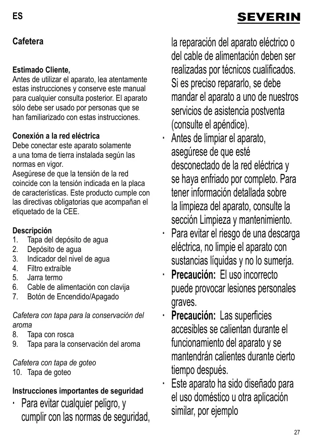 parcialmente. Si enjuaga la jarra con agua caliente antes de utilizarla, se mantendrá caliente el café durante mas tiempo. Esta jarra esta hecha de cristal aislante de alta calidad, con doble pared de cristal para un mejor aislamiento. Cualquier marca en el interior de la jarra como burbujas o arañazos no afecta en absoluto al mantenimiento de la temperatura. En caso de que la jarra esté dañada por alguna de las razones mencionadas anteriormente, hay riesgo de que el cristal estalle. De cualquier modo, esto solo ocurriría en caso de que el cristal de la jarra esté realmente muy dañado. ∙ Nunca beba directamente de la jarra y no ponga su mano en el interior de ésta. Cierre siempre la jarra con la tapa de rosca. El café puede ser servido fácilmente girando media vuelta la tapa. Supervise la cafetera mientras la utiliza y manténgala fuera del alcance de los niños. Mantenimiento de la jarra termo: ∙ Evite los golpes y cambios bruscos de temperatura. ∙ No agite el contenido de la jarra, por ejemplo con una cuchara de metal. ∙ No utilizar cepillos de cerdas duras o limpiadores abrasivos para su limpieza. ∙ No limpiar el interior con un trapo, pues, las partículas de polvo pueden rallar el cristal. ∙ No apto para lavavajillas. ∙ No apto para microondas. Desincrustación ∙ Dependiendo de la calidad del agua (contenido de cal) en su zona así como de la frecuencia con que la use, y para garantizar un funcionamiento adecuado, es necesario eliminar la cal con frecuencia de todos los aparatos domésticos termales que usan agua caliente (es decir, eliminar los residuos calizos). ∙ La garantía quedará anulada cuando el aparato no funcione correctamente debido a la no eliminación de los depósitos de cal. ∙ Si cuando se hace café se nota que aumenta el tiempo de elaboración y también el ruido, esto quiere decir que es necesario desincrustar la cafetera. ∙ Es muy difícil eliminar la acumulación excesiva de depósitos de cal, aun cuando se usan agentes desincrustadores muy fuertes. También podrían producirse fugas en el equipo de elaboración del café. Por ello recomendamos que la cafetera se desincruste cada treinta o cuarenta ciclos de elaboración de café. Para el desincrustado se podrá usar una mezcla de vinagre de la forma siguiente: ∙ Mezcle 80 ml de vinagre concentrado con la cantidad máxima indicada de agua fría. ∙ Vierta la solución desincrustadora en el recipiente para el agua, introduzca un filtro de papel en el soporte del filtro sin añadir café molido según se describe en la sección Elaboración del café, y permita que el aparato complete un ciclo de filtración. Repita el proceso si fuera necesario. Durante la desincrustación, asegúrese de que existe suficiente ventilación y no inhale el vapor del vinagre. ∙ Para limpiar la cafetera después de la desincrustación, déjela que opere durante 2 o 3 filtraciones con agua limpia. ∙ No tire el descalcificador en un fregadero revestido de esmalte. Limpieza y mantenimiento ∙ Antes de limpiar el aparato, asegúrese de que esté desconectado de la red eléctrica y se haya enfriado por completo. ∙ Para evitar el riesgo de una descarga eléctrica, no limpie el aparato con sustancias líquidas y no lo sumerja. La cafetera se podrá limpiar con un paño ligeramente húmedo y un detergente suave. Séquelo a continuación. ∙ No emplee productos de limpieza abrasivos o muy fuertes. ∙ Para extraer el café molido, abra el filtro extraíble y extráigalo. Tire el café molido usado (al tratarse de una sustancia natural, puede utilizarse como abono). Enjuague el filtro extraíble, vuelva a colocarlo y ciérrelo. ∙ No desmonte la jarra termo ni tampoco la introduzca en el agua. Limpie el exterior de la jarra con un paño húmedo. ∙ Limpie el interior con agua jabonosa templada y con la ayuda de un cepillo de cerdas suaves. ∙ Para eliminar manchas persistentes de café del interior de la jarra termo, llene la jarra con agua caliente y añada una cucharadita de bicarbonato. Cierre la jarra con la tapa de rosca. Déjela a remojo durante algunas horas. Siempre enjuáguela antes de volver a utilizarla. ∙ La tapa de goteo se puede limpiar con agua y jabón; después enjuagar abundantemente con agua corriente.