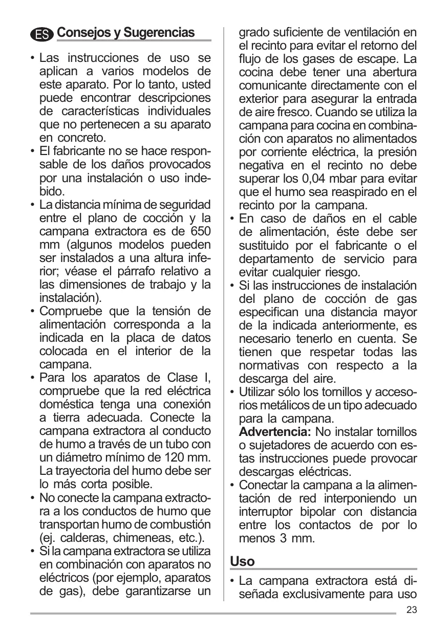 ES Consejos y Sugerencias • Las instrucciones de uso se aplican a varios modelos de este aparato. Por lo tanto, usted puede encontrar descripciones de características individuales que no pertenecen a su aparato en concreto. • El fabricante no se hace responsable de los daños provocados por una instalación o uso indebido. • La distancia mínima de seguridad entre el plano de cocción y la campana extractora es de 650 mm (algunos modelos pueden ser instalados a una altura inferior; véase el párrafo relativo a las dimensiones de trabajo y la instalación). • Compruebe que la tensión de alimentación corresponda a la indicada en la placa de datos colocada en el interior de la campana. • Para los aparatos de Clase I, compruebe que la red eléctrica doméstica tenga una conexión a tierra adecuada. Conecte la campana extractora al conducto de humo a través de un tubo con un diámetro mínimo de 120 mm. La trayectoria del humo debe ser lo más corta posible. • No conecte la campana extractora a los conductos de humo que transportan humo de combustión (ej. calderas, chimeneas, etc.). • Si la campana extractora se utiliza en combinación con aparatos no eléctricos (por ejemplo, aparatos de gas), debe garantizarse un