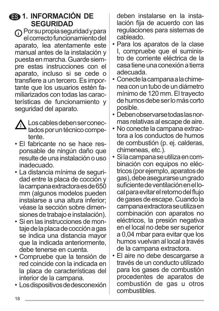• Los cables deben ser conectados por un técnico compe- • tente. • El fabricante no se hace responsable de ningún daño que resulte de una instalación o uso • inadecuado. • La distancia mínima de seguridad entre la placa de cocción y la campana extractora es de 650 mm (algunos modelos pueden instalarse a una altura inferior; véase la sección sobre dimensiones de trabajo e instalación). • Si en las instrucciones de montaje de la placa de cocción a gas se indica una distancia mayor que la indicada anteriormente, debe tenerse en cuenta. • Compruebe que la tensión de • red coincide con la indicada en la placa de características del interior de la campana. • Los dispositivos de desconexión 18