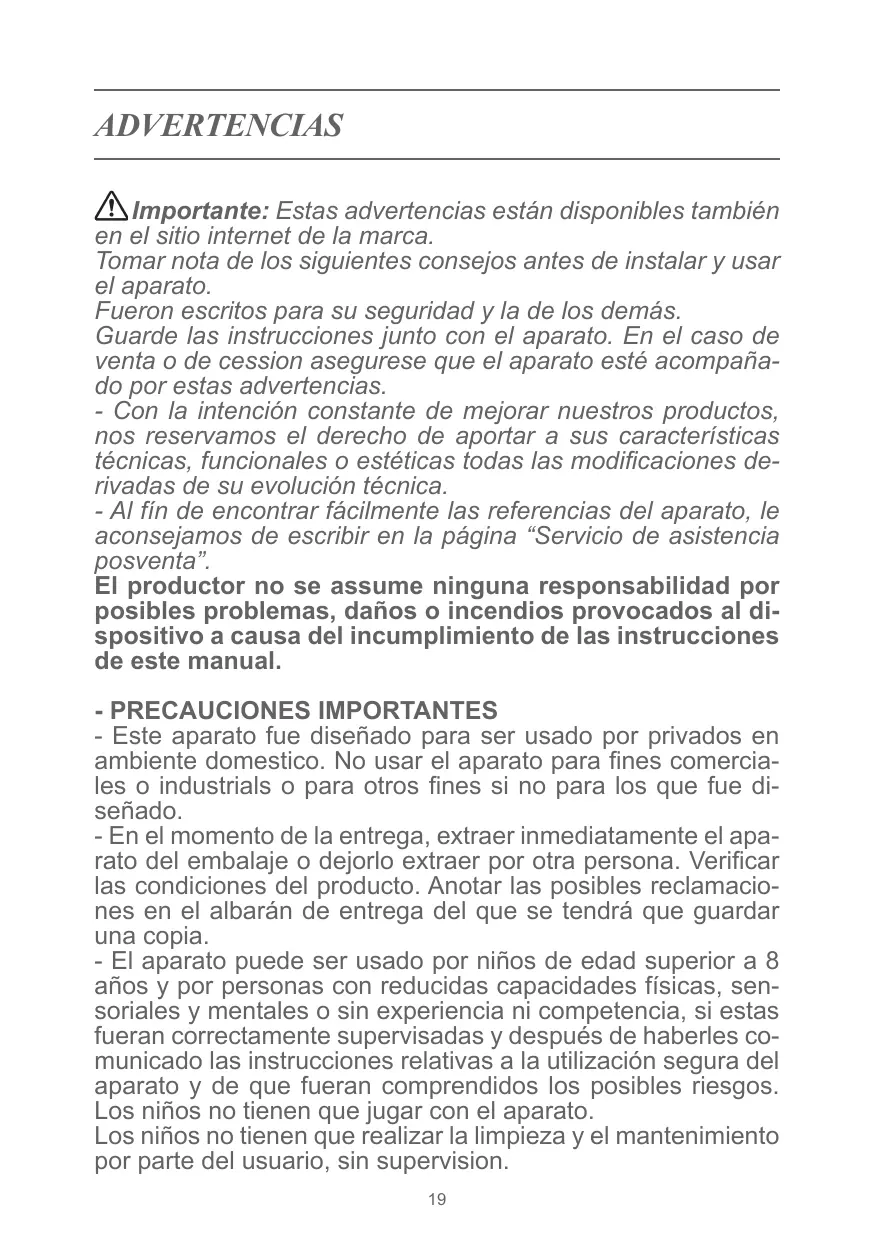 Tomar nota de los siguientes consejos antes de instalar y usar el aparato. Fueron escritos para su seguridad y la de los demás. Guarde las instrucciones junto con el aparato. En el caso de venta o de cession asegurese que el aparato esté acompañado por estas advertencias. - Con la intención constante de mejorar nuestros productos, nos reservamos el derecho de aportar a sus características técnicas, funcionales o estéticas todas las modificaciones derivadas de su evolución técnica. - Al fín de encontrar fácilmente las referencias del aparato, le aconsejamos de escribir en la página “Servicio de asistencia posventa”. El productor no se assume ninguna responsabilidad por posibles problemas, daños o incendios provocados al dispositivo a causa del incumplimiento de las instrucciones de este manual. - PRECAUCIONES IMPORTANTES - Este aparato fue diseñado para ser usado por privados en ambiente domestico. No usar el aparato para fines comerciales o industrials o para otros fines si no para los que fue diseñado. - En el momento de la entrega, extraer inmediatamente el aparato del embalaje o dejorlo extraer por otra persona. Verificar las condiciones del producto. Anotar las posibles reclamaciones en el albarán de entrega del que se tendrá que guardar una copia. - El aparato puede ser usado por niños de edad superior a 8 años y por personas con reducidas capacidades físicas, sensoriales y mentales o sin experiencia ni competencia, si estas fueran correctamente supervisadas y después de haberles comunicado las instrucciones relativas a la utilización segura del aparato y de que fueran comprendidos los posibles riesgos. Los niños no tienen que jugar con el aparato. Los niños no tienen que realizar la limpieza y el mantenimiento por parte del usuario, sin supervision. 19