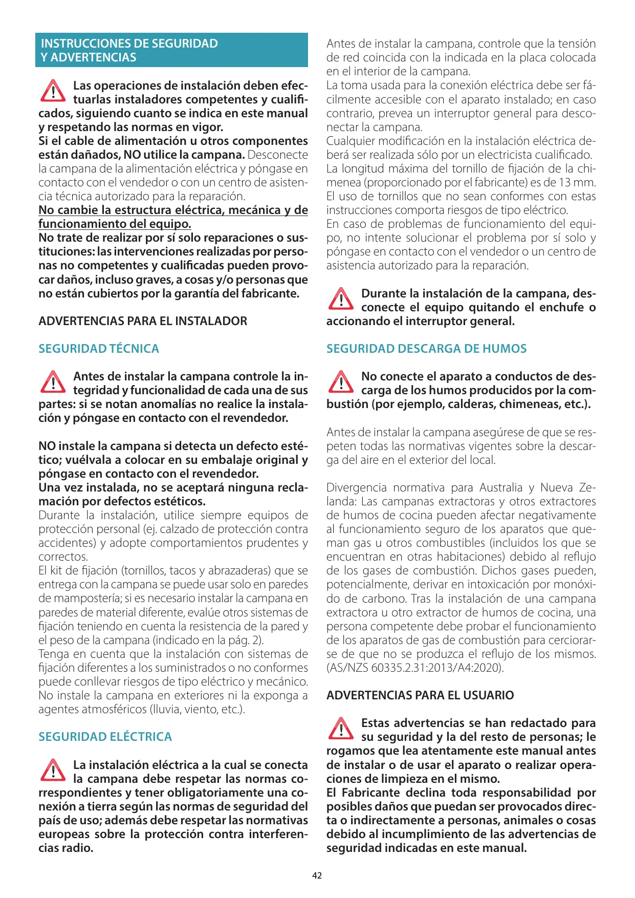 (AS/NZS 60335.2.31:2013/A4:2020). ADVERTENCIAS PARA EL USUARIO Estas advertencias se han redactado para su seguridad y la del resto de personas; le rogamos que lea atentamente este manual antes de instalar o de usar el aparato o realizar operaciones de limpieza en el mismo. El Fabricante declina toda responsabilidad por posibles daños que puedan ser provocados directa o indirectamente a personas, animales o cosas debido al incumplimiento de las advertencias de seguridad indicadas en este manual.